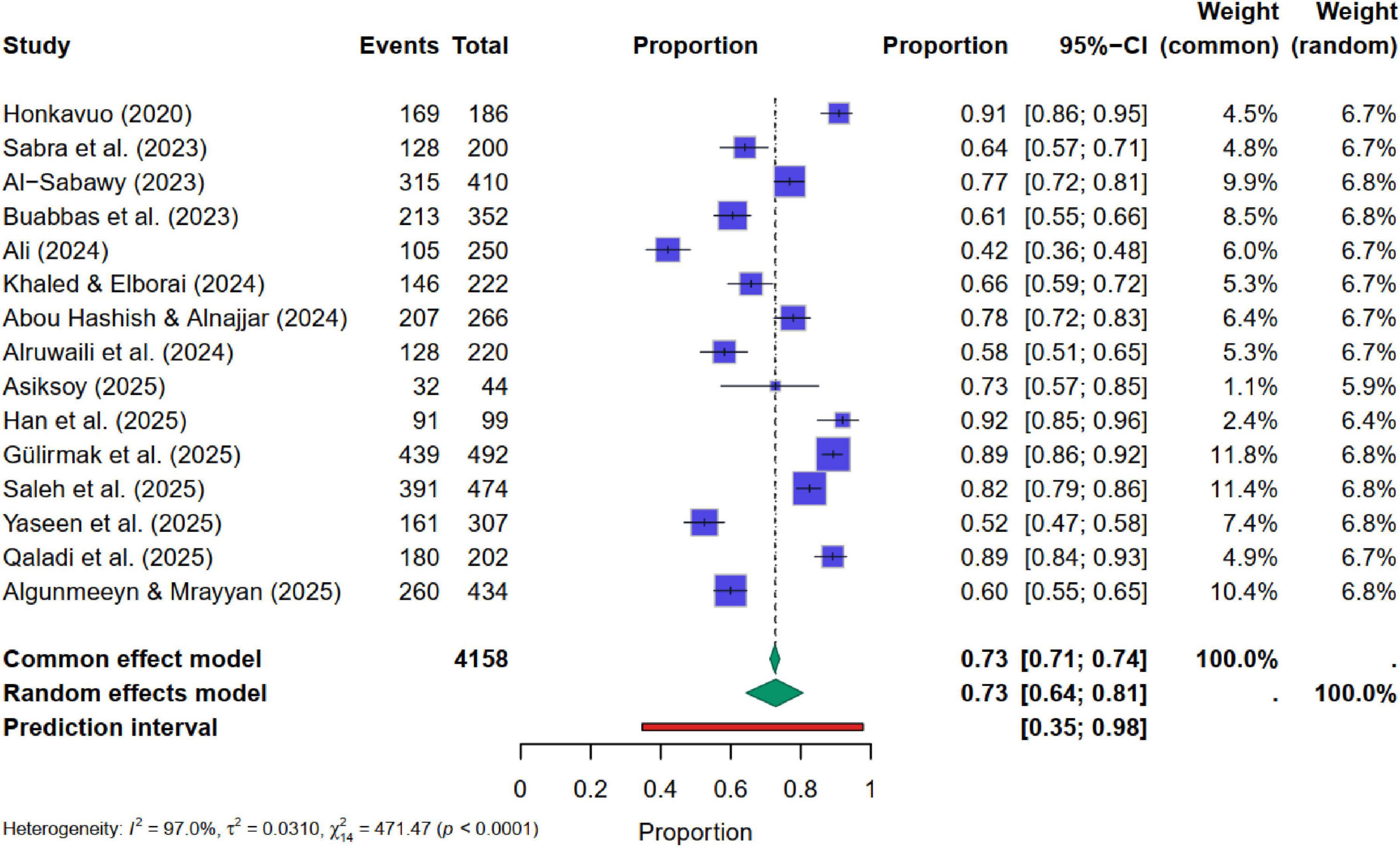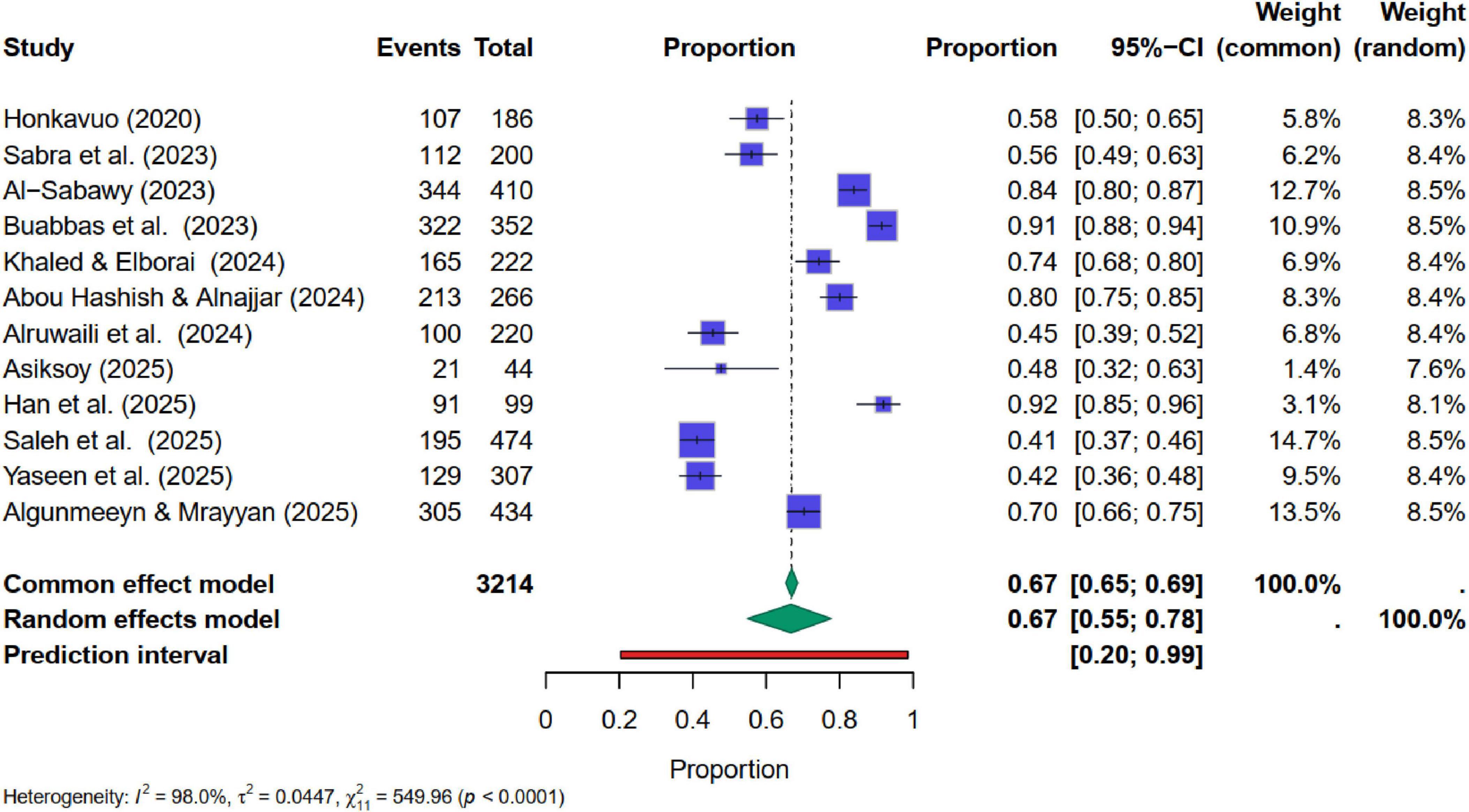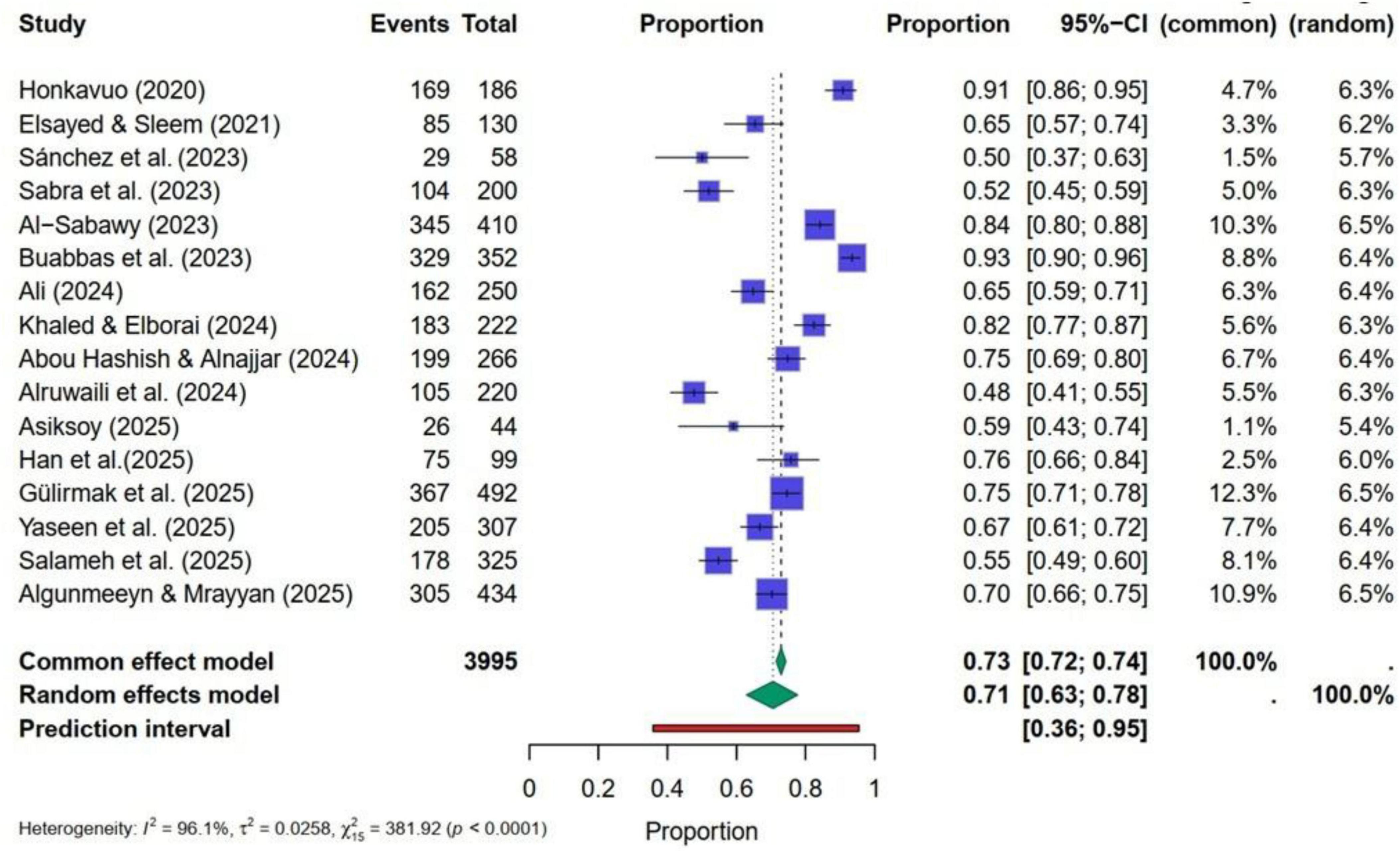 Eighteen (17) distinct studies were used in the meta-analysis, and the extracted data included the following headings: first author, year, title of the study, country, nursing group, sample size, and type and description of the intervention used. This extracted information was stored in Excel sheets. Later, meta-analysis was performed in R 4.5.0 (R Foundation for Statistical Computing, Vienna, Austria) using the “meta” and “metafor” libraries. Studies reported three aspects of AI-related awareness, attitude, and implementation in terms of percentages, which are equivalent to prevalence in this study. The extracted prevalence was pooled using common and random-effects models, considering the heterogeneity of individual study findings. The 95% confidence intervals (CI) were also computed for pooled findings. Heterogeneity was assessed through Q, I2, Tau2, and p-value. Those findings, which showed a strong and significant presence of heterogeneity (p < 0.05), were pooled through the random effect model. Pooled estimates and heterogeneity analysis findings were presented in a Forest plot, which is renowned for its comprehensiveness. Publication bias was evaluated through the Funnel plot and Egger’s test. Funnel plot inspection often suggests asymmetry and can lead to subjective and biased findings. Therefore, to augment the graphical view, Egger’s test was used, along with its p-value. Sensitivity analyses were also conducted to assess the robustness of findings. Meta-regression analysis was also executed to investigate the effects of sample size, nursing groups, year of publication, and country of study on pooled estimates. Further, nursing groups were considered an important factor to perform subgroup analysis, as that variable might change the mean percentages of AI-related awareness, attitudes, and implementation. The details of the included studies, along with their basic characteristics, are presented in Supplementary Appendix B.