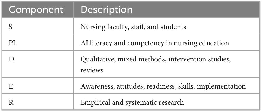 This study employed a mixed-methods approach combining systematic review, thematic synthesis, and meta-analysis to provide a holistic evaluation of AI literacy and competency in nursing education. This systematic literature review (SLR) and meta-analysis was registered at PROSPERO (CRD420251090108) and conducted using the Preferred Reporting Items for Systematic Reviews and Meta-Analyses (PRISMA) 2020 guidelines. The research framework SPIDER (16) (S for Sample, PI for Phenomenon of Interest, D for Design, E for Evaluation, and R for Research type) was adopted for the study to structure the review (Table 1).