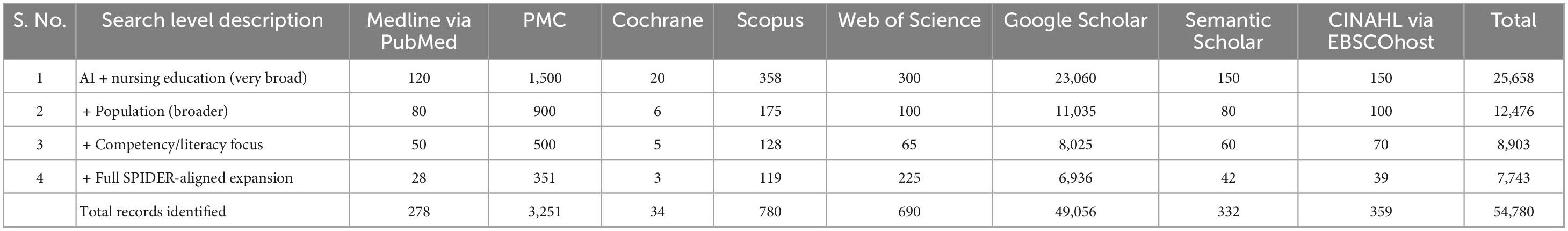 Table 2 provides a step-by-step overview of the multi-level search strategy employed in this review, along with the number of articles retrieved at each stage. An initial total of 54,780 records were identified across the selected databases. The search was conducted at four progressive levels, each building on the previous one to enhance specificity and coverage. In Level 1, the search used the basic terms “Artificial Intelligence” OR “AI” AND “nursing education.” Level 2 expanded the scope by incorporating terms such as “Artificial Intelligence” OR “AI” OR “machine learning” OR “deep learning” AND “nursing students” OR “nursing faculty” OR “nurse educators” OR “student nurses” AND “nursing education” OR “nurse training.” Level 3 further refined the strategy by adding “ChatGPT” AND “clinical instructors,” along with outcome-related terms such as “competency” OR “training” OR “readiness” OR “AI literacy” OR “digital literacy.” Finally, Level 4 offered the most comprehensive search by including broader educational contexts such as “higher education,” “undergraduate nursing,” and “professional training,” combined with terms like “generative AI,” “technological proficiency,” and “informatics education,” AND attitudinal or perception-based concepts such as “attitudes” OR “perceptions” OR “technology acceptance” OR “self-efficacy.” These recent search terms were included to capture emerging literature following the introduction of large language models; however, they were applied alongside broader foundational keywords (“Artificial Intelligence,” “Machine Learning,” and “Deep Learning”) to maintain balance and avoid overrepresentation of newer studies in generative AI. For conceptual clarity, traditional AI refers to rule-based or machine learning driven applications. In contrast, generative AI encompasses models capable of creating new content such as text, images, or simulations (e.g., ChatGPT, image generators). Both forms were included to provide a comprehensive overview of AI integration in nursing education.