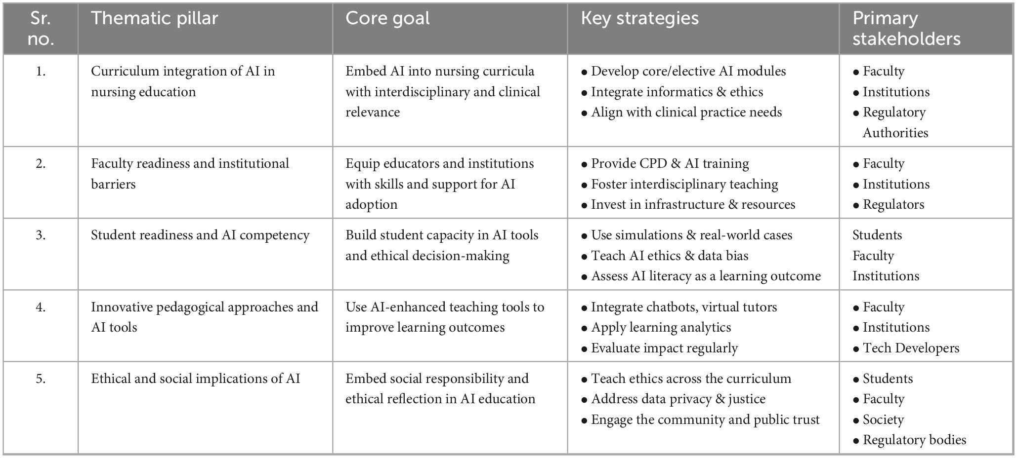Collectively, five themes present a cohesive narrative demonstrating that AI integration in nursing education requires coordinated efforts across curriculum reform, faculty capacity building, student empowerment, pedagogical innovation, and ethical governance. A concise synthesis of the thematic pillars, core goals, strategies, and stakeholders is provided in Table 3, and an operational policy-and-governance blueprint to enact these pillars is outlined in Table 4. This multidimensional approach will ensure that the future nursing workforce is equipped with digital proficiency, ethical sensitivity, and clinical acumen for an AI-driven healthcare environment.