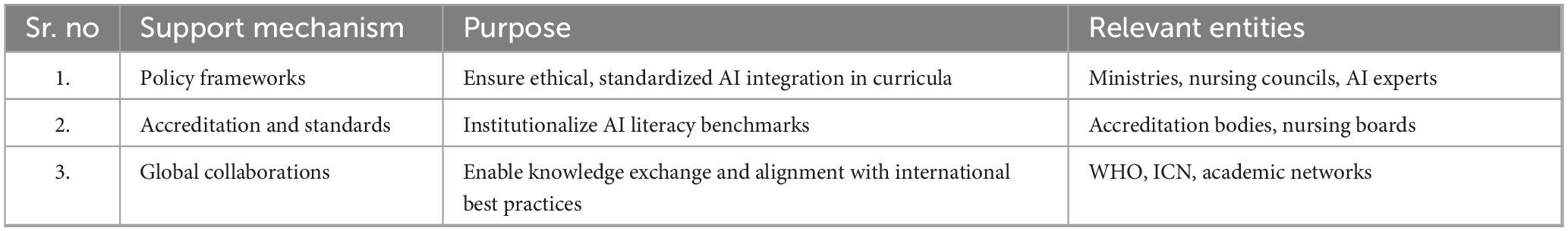 Furthermore, faculty attitudes and adoption behaviors are shaped by their perceptions of technology and generational differences (37–41). Younger faculty, often digital natives, exhibit greater comfort and curiosity, while older educators may be more cautious, influenced by limited, poor exposure to AI tools. The ageing of the faculty workforce further slows adoption and underscores the urgency for mentoring and cross-generational collaboration (37, 38). Some faculty members view AI as beneficial for streamlining tasks such as grading and feedback (39), whereas others fear that it undermines academic integrity or traditional pedagogical authority (40). Institutional messaging plays a decisive role when AI is framed as a collaborative tool rather than a replacement; receptivity increases (41). Conversely, top-down technology implementations, without faculty engagement, often lead to disengagement or performative compliance (42), highlighting the importance of transparent dialogue and co-creation of AI adoption strategies with faculty. Persistent infrastructural problems such as insufficient AI-compatible devices, unstable internet, and lack of advanced learning platforms impede practical integration, and with the digital divide (25, 30, 34). Many institutions still treat AI as optional content, leaving students underprepared for AI-enabled clinical environments. To overcome these limitations, faculty learning communities, innovation hubs, and mentorship initiatives have been proposed as sustainable models for capacity building (43). Finally, AI should be utilized in nursing education in a manner that is inclusive and equitable (25). When responsibly applied, AI can make learning more personalized, engaging, and effective, but this transition is both a technological and moral transition requiring reflection on values, ethics, and pedagogy. Overall, this theme highlights that faculty readiness depends on the synergy of professional development, leadership engagement, and institutional investment.