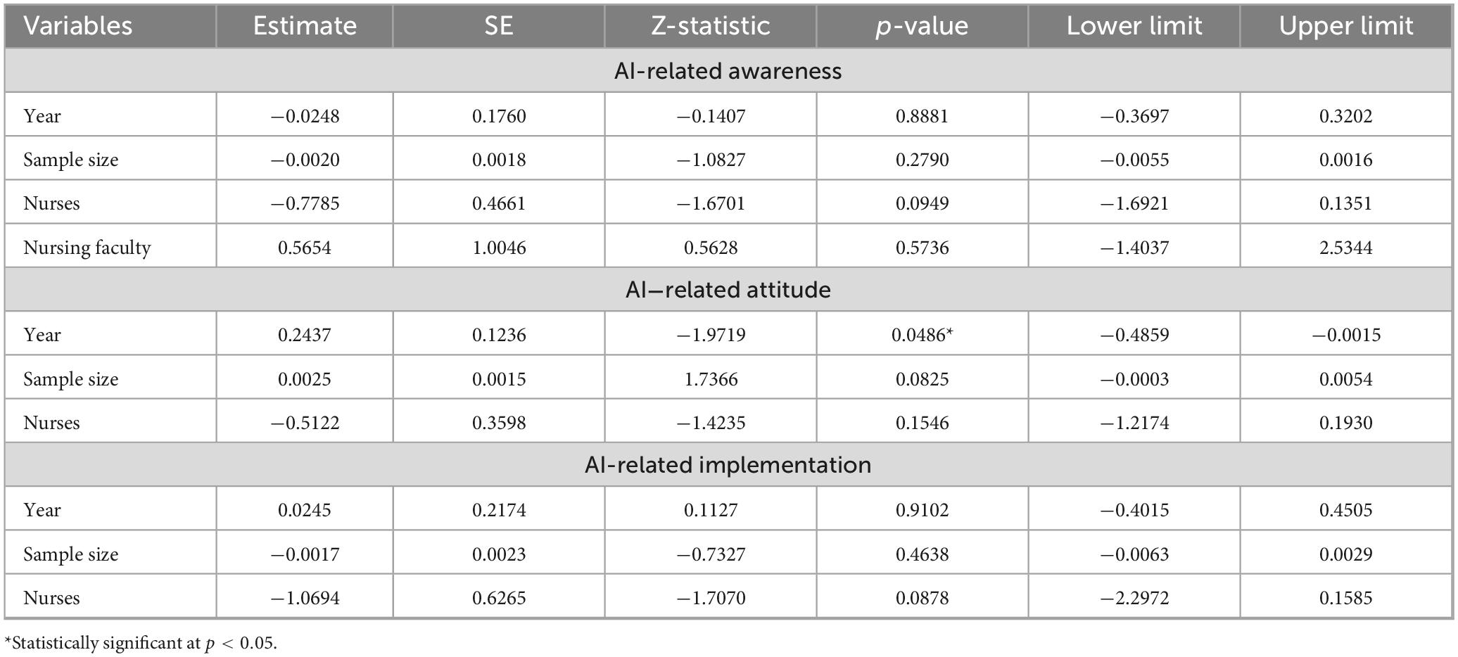 The meta-analysis found that the attitudes of nursing faculty and students show an increasing receptiveness to AI. This reflects a cultural shift in health education, viewing AI as a tool for enhancing care, learning, and efficiency. Acceptance of AI, however, was often limited due to ethical issues or structural barriers. Nursing faculty express ambivalence about the use of AI in nursing education due to concerns about potential clinical errors (11). Further, substantial variations were observed in AI-related awareness, attitude, and implementation, which were further augmented with large confidence intervals. The very high heterogeneity (I2 > 97%) across pooled analyses indicates a considerable between-study variability, suggesting that the aggregated estimates (awareness: 73%, attitude: 71%, implementation: 67%) should be interpreted with caution. This limitation is acknowledged in the manuscript, which emphasizes that these pooled proportions provide directional rather than definitive evidence. Although substantial variation was observed, the meta-regression analysis (Table 5) did not identify any significant predictors of awareness or implementation, except for the year of publication in the case of attitude (p < 0.05). Therefore, these differences should be interpreted cautiously, as the heterogeneity likely reflects unmeasured contextual or methodological influences rather than definitive determinants such as faculty readiness, institutional factors, or resource availability. Part of this heterogeneity also reflects geographic and cultural diversity across the included studies. Institutions from East Asia and Northern Europe, such as South Korea (61) and Finland (62), benefit from long-standing digital literacy initiatives, while Middle Eastern and South Asian contexts, such as Iraq (63), Palestine (57), and Egypt (58), exhibit slower progress due to resource constraints and cautious attitudes toward technology.