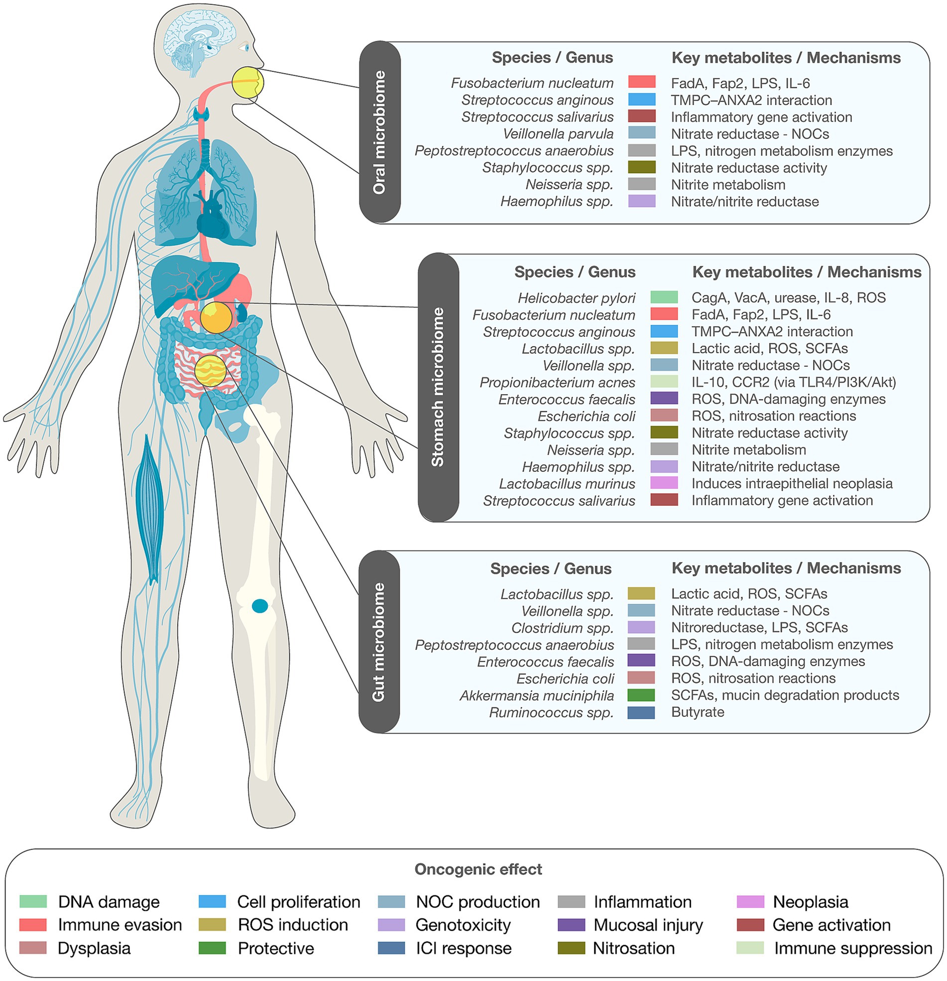 Figure 1. Landscape of the gastric cancer microbiome. The schematic depicts bacterial taxa originating from the oral cavity, stomach, and gut, alongside representative microbial metabolites and molecular pathways implicated in tumorigenesis.