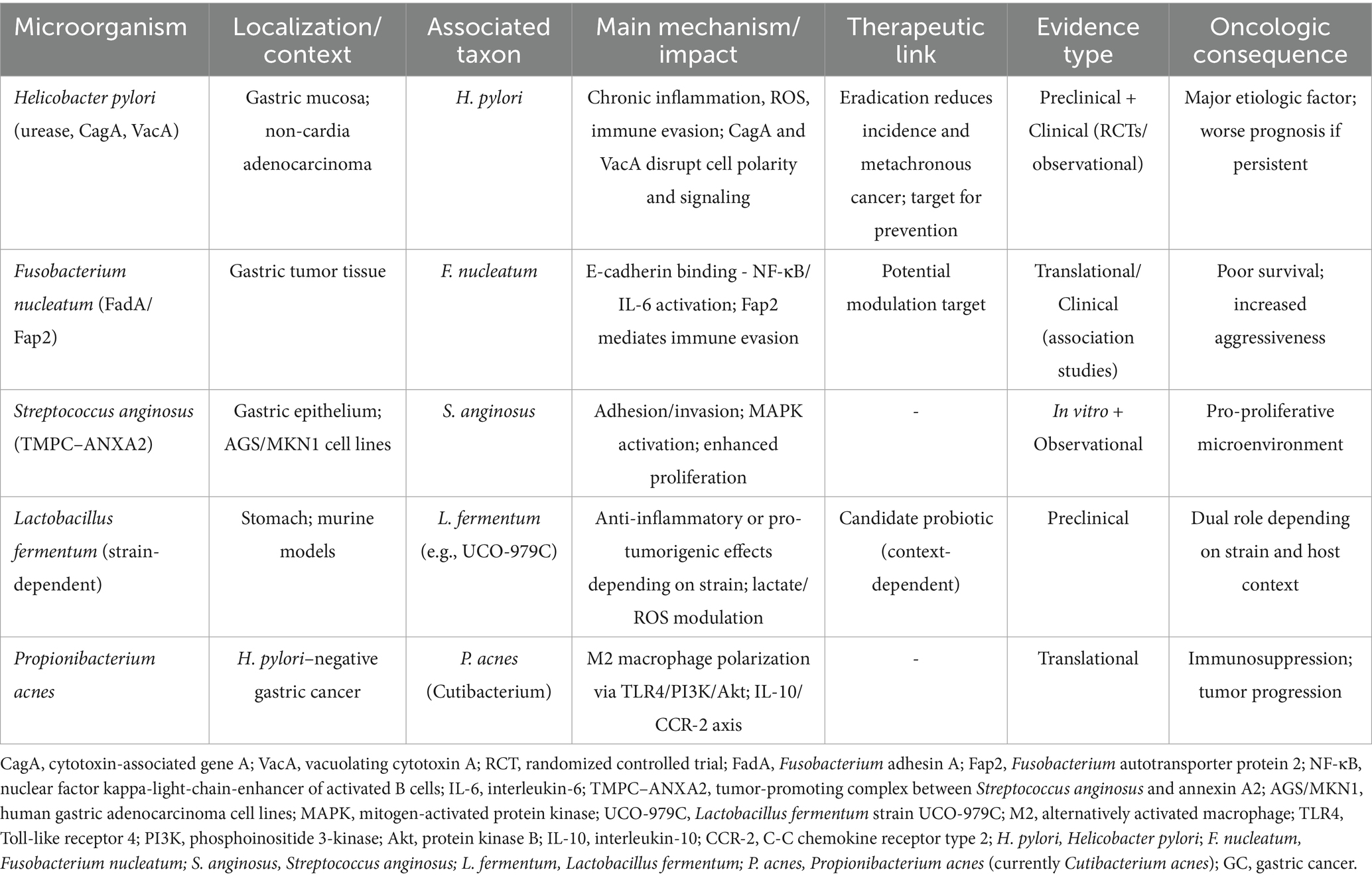 Lactobacillus fermentum: while classically viewed as a commensal with probiotic potential, certain Lactobacillus species, including Lactobacillus fermentum, exhibit dynamic roles in gastric cancer depending on strain-specific functions and disease context. Co-occurrence analyses reveal that L. fermentum and L. salivarius are present across various stages of gastric carcinogenesis, from early-stage disease to precancerous lesions and invasive tumors, highlighting their potential immunomodulatory roles (89). Importantly, evidence of Lactobacillus enrichment within GC tissues and lactate-driven metabolic and immunologic reprogramming suggests that not all lineages act uniformly as “protective”; rather, tumor-associated niches may favor Lactobacillus overgrowth with pro-tumor correlates in specific contexts (91). Interestingly, specific strains such as L. fermentum UCO-979C, isolated from the human stomach, demonstrate anti-H. pylori and anti-inflammatory activities, attenuating chronic H. pylori-induced inflammation by modulating epithelial immune responses; in murine and cell-based models, UCO-979C reduces pro-inflammatory cytokines/chemokines and interferes with urease activity and adherence, changes associated with improved mucosal defense (92, 93). Thus, the seemingly contradictory reports are reconciled by strain-level heterogeneity (e.g., UCO-979C vs. non-characterized Lactobacillus overgrowth) and by the anatomical/microenvironmental niche (healthy vs. tumor tissue) (94).