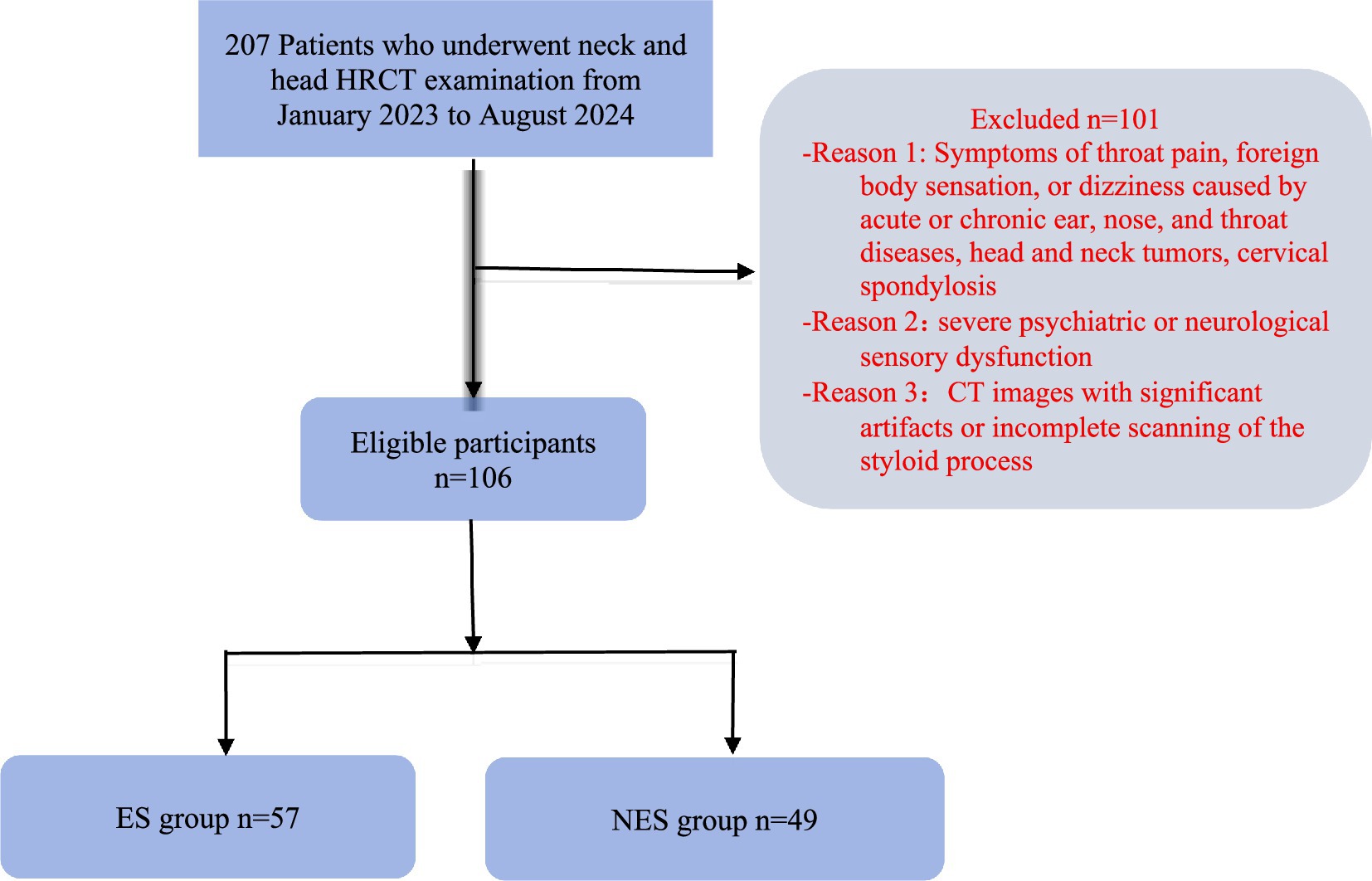 A total of 207 patients who underwent head and neck HRCT examinations at the Second Affiliated Hospital of Zhejiang Chinese Medical University between January 2023 and August 2024 were retrospectively collected. The patients sex, age at presentation, chief complaints, and HRCT imaging data were analyzed and recorded. Exclusion criteria: (1) symptoms such as pharyngeal pain, foreign body sensation in the pharynx, or vertigo after head rotation caused by acute or chronic otolaryngological diseases, head and neck tumors, or cervical spondylosis. (2) patients with severe psychiatric, neurological, or sensory dysfunction. (3) HRCT images with significant artifacts or incomplete coverage of the SP. A total of 101 patients were excluded, and 106 patients were finally included as study subjects. The ES group included patients who were eligible for the following Inclusion Criteria: (1) presence of at least one of the following chief symptoms—pharyngeal pain, foreign body sensation in the throat, vertigo on head rotation, anterolateral cervical pain, or radiating otalgia. (2) HRCT measurement of SP length >30 mm. (3) Age between 18 and 80 years. At last, a total of 57 patients were enrolled in ES group, involving 114 elongated SP, 35 males and 22 females, with a mean age of 56.89 ± 15.99 years. In contrast, the NES group comprised patients without the above mentioned symptoms, HRCT measurement of SP length <30 mm, and aged between 18 and 80 years. This NES group included 49 patients, involving 98 normal SP, including 22 males and 27 females, with a mean age of 55.08 ± 16.30 years. As follow in Figure 1. This study was approved by the hospital’s ethics committee (approval number: 2025-LW-083-01).
