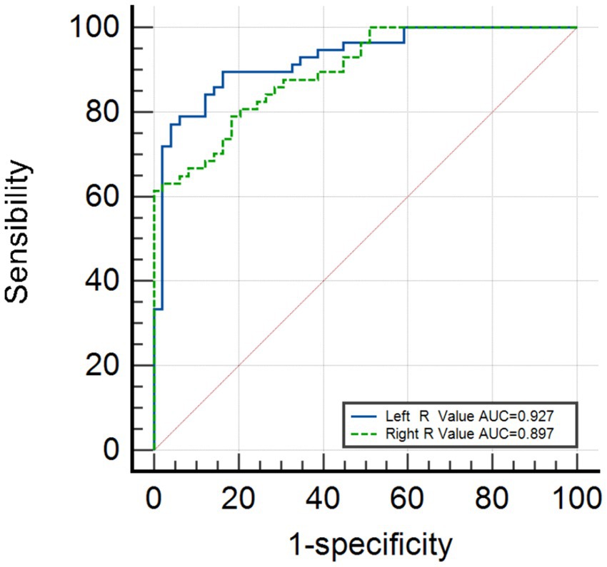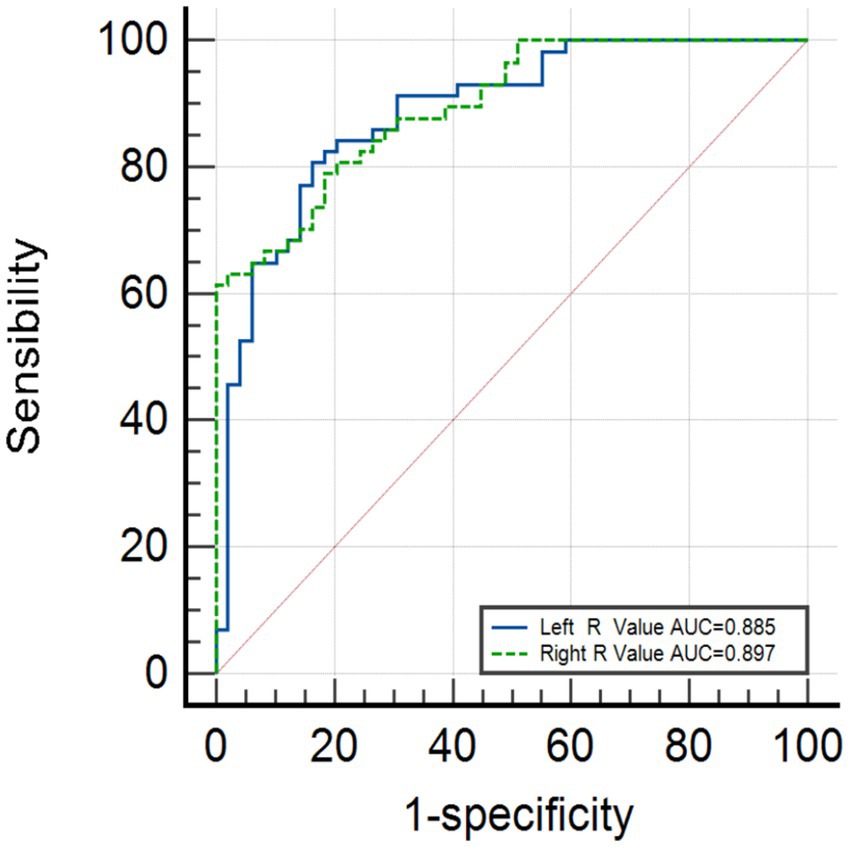 Figure 3 shows that the area under the curve (AUC) for the left R-value is 0.885 (95% CI, 0.822–0.949), and the AUC for the right R-value is 0.897 (95% CI: 0.841–0.952). The optimal cutoff value for the left side is 2.86, with a sensitivity of 80.7% and a specificity of 83.7%. The optimal cutoff value for the right side is 2.89, with a sensitivity of 78.9% and a specificity of 81.6%. Logistic regression validation shows that the AUC for the left side is 0.927 (95% CI, 0.879–0.975), with a sensitivity of 89.5% and specificity of 83.7%, while the AUC for the right side is 0.897 (95% CI, 0.841–0.952), with a sensitivity of 78.9% and a specificity of 81.6%, as shown in Figure 4.
