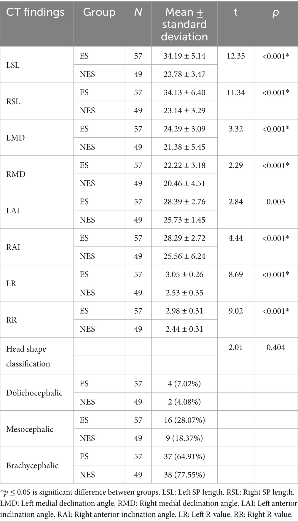 There are significant differences between the ES group and NES group in several key anatomical parameters, with bilateral SP length, inward angulation, and forward tilt angle being notably larger in the ES group compared to the NES group. Furthermore, these anatomical changes are significantly correlated with the occurrence of clinical symptoms, and the results are generally consistent with previous related literature (29). Further bivariate correlation analysis showed that SP length was positively correlated with the left inward angulation, left forward tilt angle, and right forward tilt angle, but there was no significant difference with the right inward angulation. This correlation between bilateral anatomical parameters is also in agreement with the results of multiple previous epidemiological studies (30, 31).