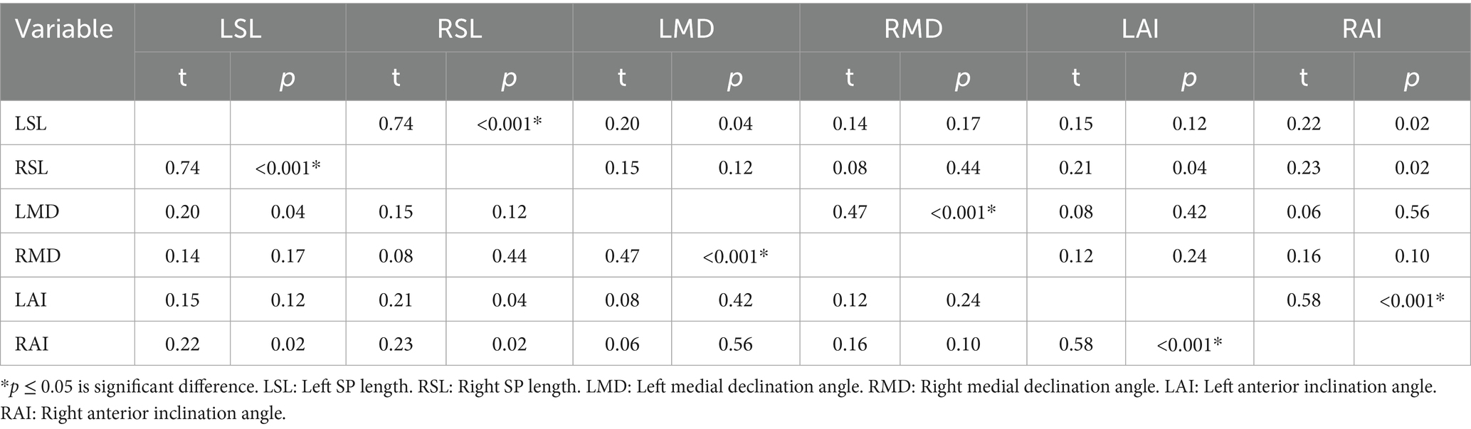 There is a certain correlation between SP length and inward angulation as well as forward tilt, but the degree of association varies: the left SP length is weakly positively correlated with the left inward angulation (r = 0.203, p = 0.037), but there is no significant correlation with the left forward tilt angle (r = 0.153, p = 0.117). the right SP length show no significant correlation with the right inward angulation (r = 0.152, p = 0.119), but is weakly positive correlated with the right forward tilt angle (r = 0.227, p = 0.019). Additionally, no significant correlation was found between inward angulation and forward tilt (left: r = 0.078, p = 0.424; right: r = 0.162, p = 0.098), as shown in Table 3.