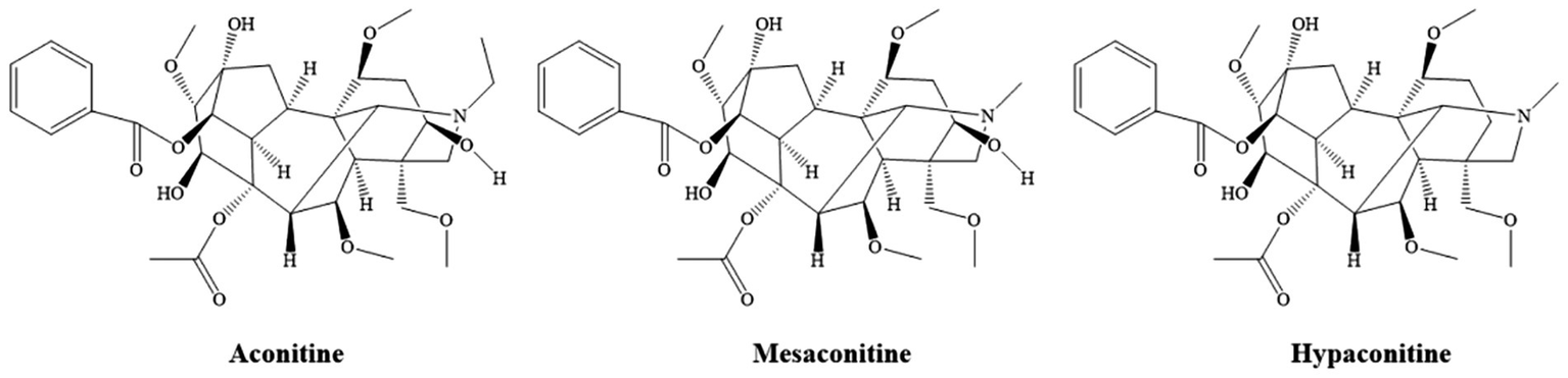 The results showed that alkaloids were the most abundant chemical constituents in XZJWP, which is consistent with the presence of Aconitum kusnezoffii Rchb. in the formulation. Aconitine alkaloids, the bioactive components unique to the Aconitum species, are known for their analgesic, anti-inflammatory, antioxidant, and antitumor properties. However, their narrow therapeutic window poses significant risks, including cardiotoxicity, hepatotoxicity, muscle toxicity, and neurotoxicity (17–20). Notably, the diester-diterpenoid alkaloids (DDAs), such as aconitine, mesaconitine, and hypaconitine (Figure 5), are highly toxic and are typically reduced through processing methods before clinical use. In this study, these three DDAs were detected in high concentrations in the XZJWP extract.