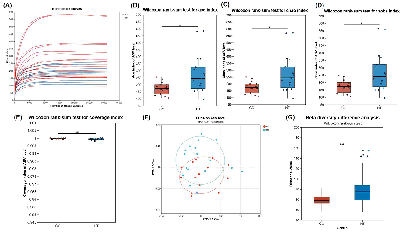 A series of graphs and plots analyzing diversity indices and comparisons between two groups, CG and HT. (A) Displays rarefaction curves. (B-D) Show box plots of Wilcoxon rank-sum tests for ace, chao, and sobs indices, with HT showing generally higher indices. (E) Presents Wilcoxon rank-sum test for coverage index with minor differences. (F) Shows a PCoA plot with sample differentiation between groups. (G) Represents a box plot for beta diversity difference analysis, indicating higher diversity in HT. Statistical significance is noted with asterisks.