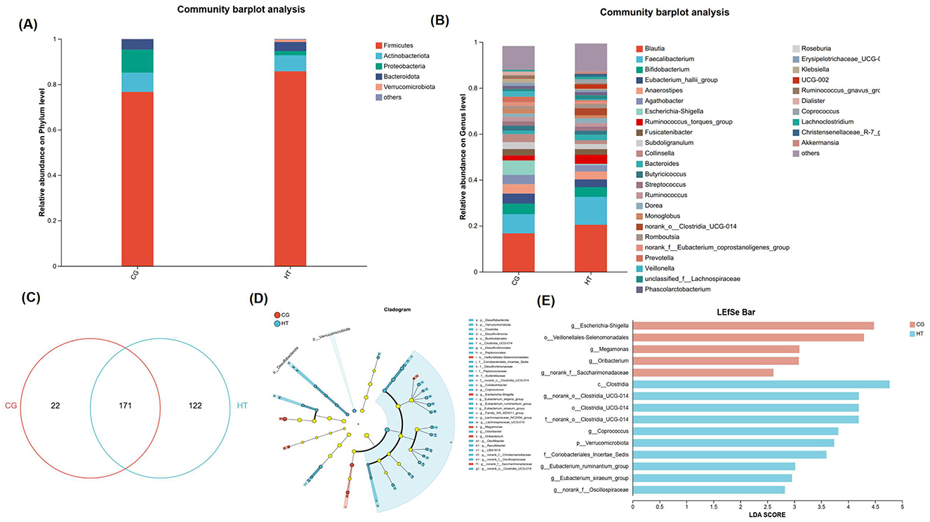 Five-panel image depicting microbial community analysis. (A) Bar plot showing relative abundance at the phylum level, with Firmicutes dominating. (B) Bar plot for genus-level abundance showing diverse genera. (C) Venn diagram shows overlapping and unique elements between CG and HT groups. (D) Cladogram visualizing taxonomic relationships, colored by group. (E) LEfSe bar chart illustrating LDA scores for taxa, highlighting significant differences between CG and HT.