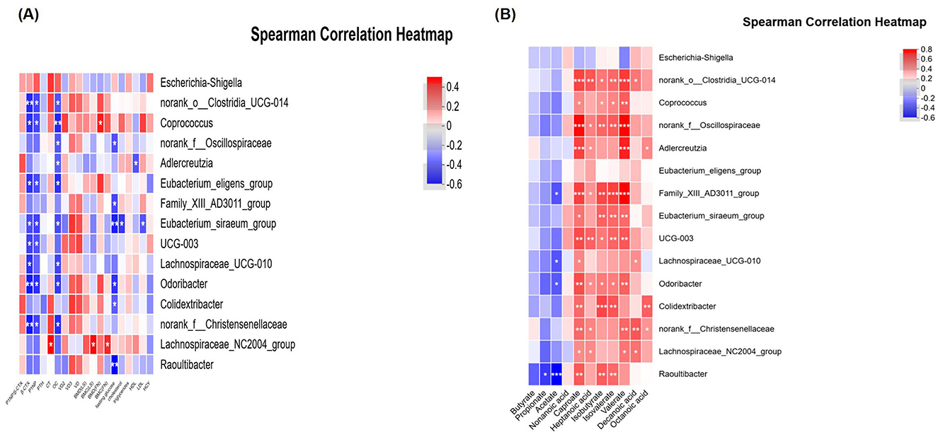 Figure 4. Correlations between the bacteria and other indexes. (A) Relationship between intestinal flora and clinical indexes. (B) Relationship between intestinal flora and SCFAs. CG, control group (MHT-); HT, hormone treatment (MHT+). *0.01 < P ≤ 0.05, **0.001 < P ≤ 0.01, ***P ≤ 0.001.