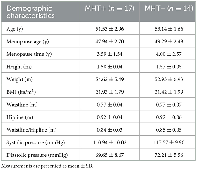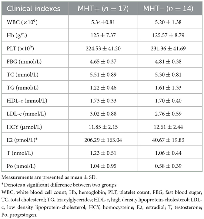 In this study, clinical information and biological samples from a cohort of 31 individuals were gathered and subjected to comprehensive analysis. The participants were divided into two groups: MHT+ group (n = 17) and MHT– group (n = 14), as detailed in Table 1. Within the MHT+ cohort, all subjects were administered estrogen, either orally through Tibolone (n = 2), or transdermally via estradiol gel (n = 2), or orally through femostone (1/10 mg) (n = 13) in combination with progestogen, the duration of MHT was 0.5 to 7 years (2.23 ± 1.88 years). No significant discrepancies were observed between the two groups with respect to age, BMI, blood pressure, smoking and alcohol consumption, the presence of common chronic diseases and medication usage. Furthermore, no significant differences were detected in circulating levels of hemoglobin (Hb), white blood cells count (WBC), platelet count (PLT), fasting blood glucose (FBG), high-density lipoprotein cholesterol (HDL-c), low-density lipoprotein cholesterol (LDL-c), total cholesterol (TC), triglycerides (TG), and homocysteine (HCY) between the two groups.
