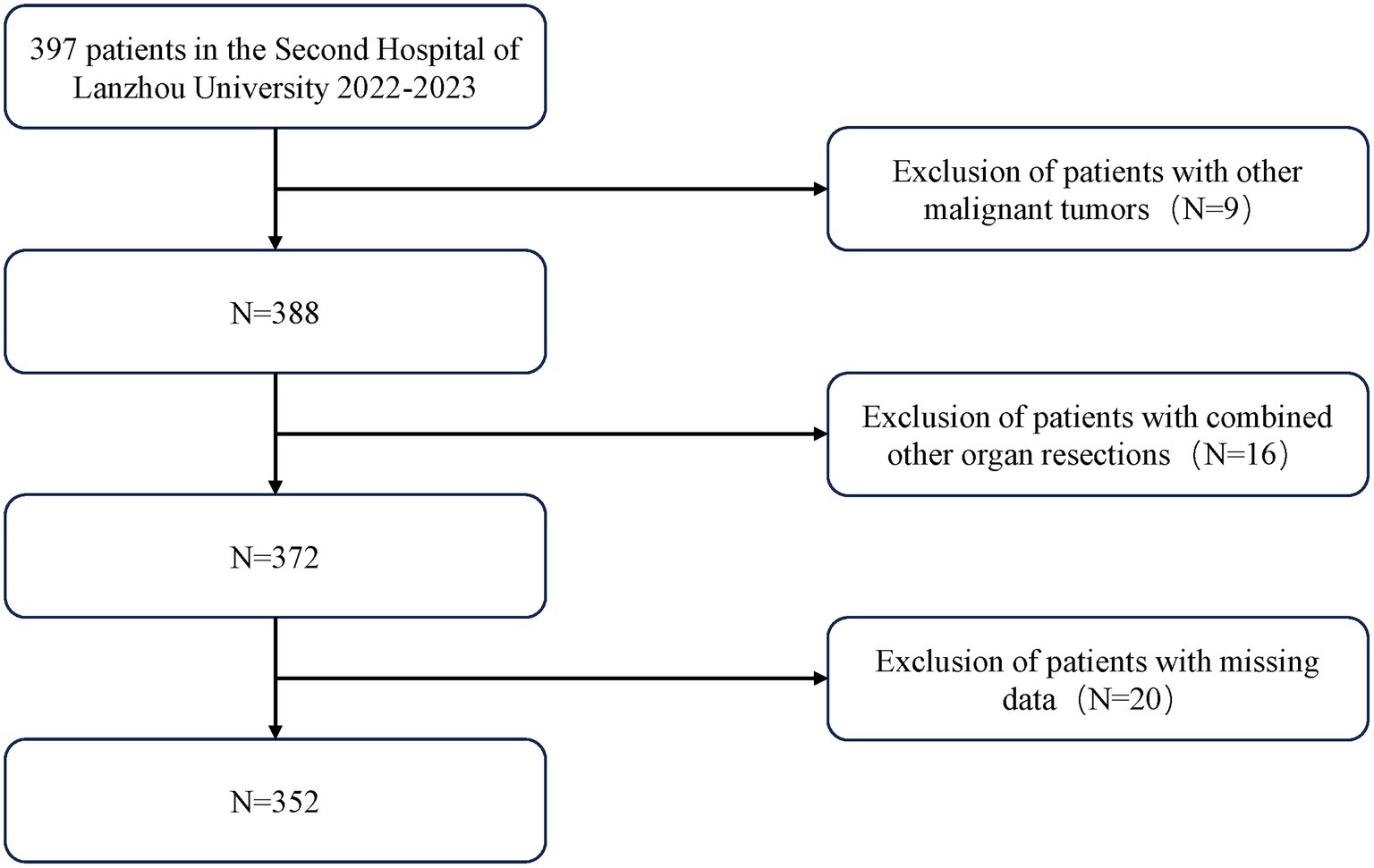 Inclusion criteria are as follows: (1) Pathologically confirmed gastric cancer post-surgery, patients underwent radical resection of the proximal, distal, or entire stomach; (2) No evidence of tumor invasion into adjacent organs or distant metastasis; (3) Data required for outcome measures are complete and comprehensive. Exclusion criteria include: (1) Patients with gastroesophageal junction cancer who underwent open thoracotomy; (2) Patients who underwent gastric stump surgery, recurrent cancer surgery, or combined surgery with other organ surgeries; (3) Patients with special gastric tumors, including lymphoma, hepatoma, neuroendocrine tumors, or gastrointestinal stromal tumors (GISTs). The final sample included 352 patients (Figure 1).