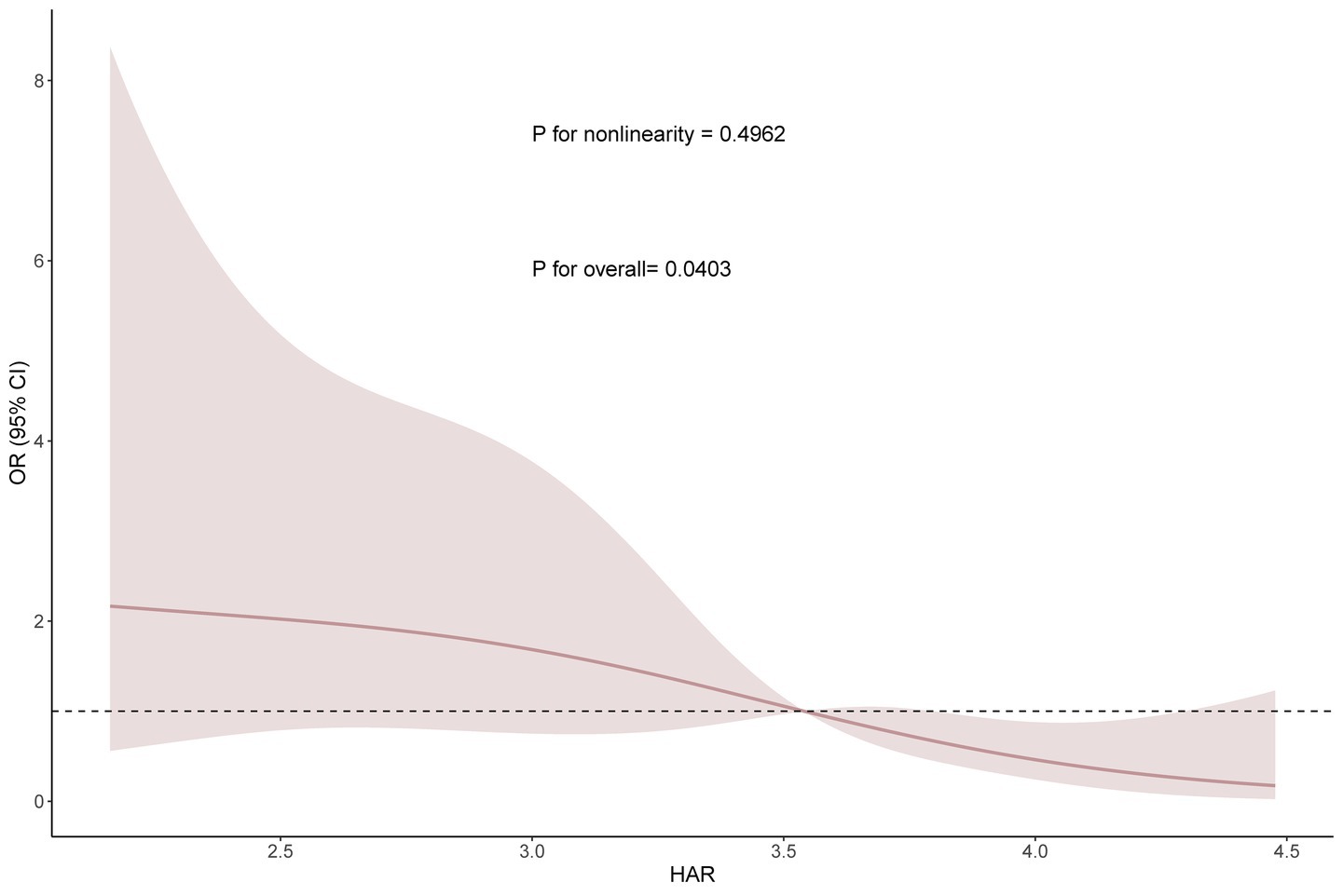 Based on Model 3, we performed restricted cubic spline analysis to further explore the relationship between HAR and Clavien-Dindo ≥II complications (Figure 3). The results showed that there was no nonlinear relationship between HAR and complications (nonlinear test p value = 0.4962). To further elucidate the nature of this relationship, we subsequently conducted a threshold effect analysis (Table 4). Threshold effect analysis showed that no significant association was observed when the HAR value was below 2.87; however, when the HAR value was equal to or above 2.87, there was a significant negative correlation with event risk (OR, 0.21; 95% CI: 0.06–0.76; p = 0.018).