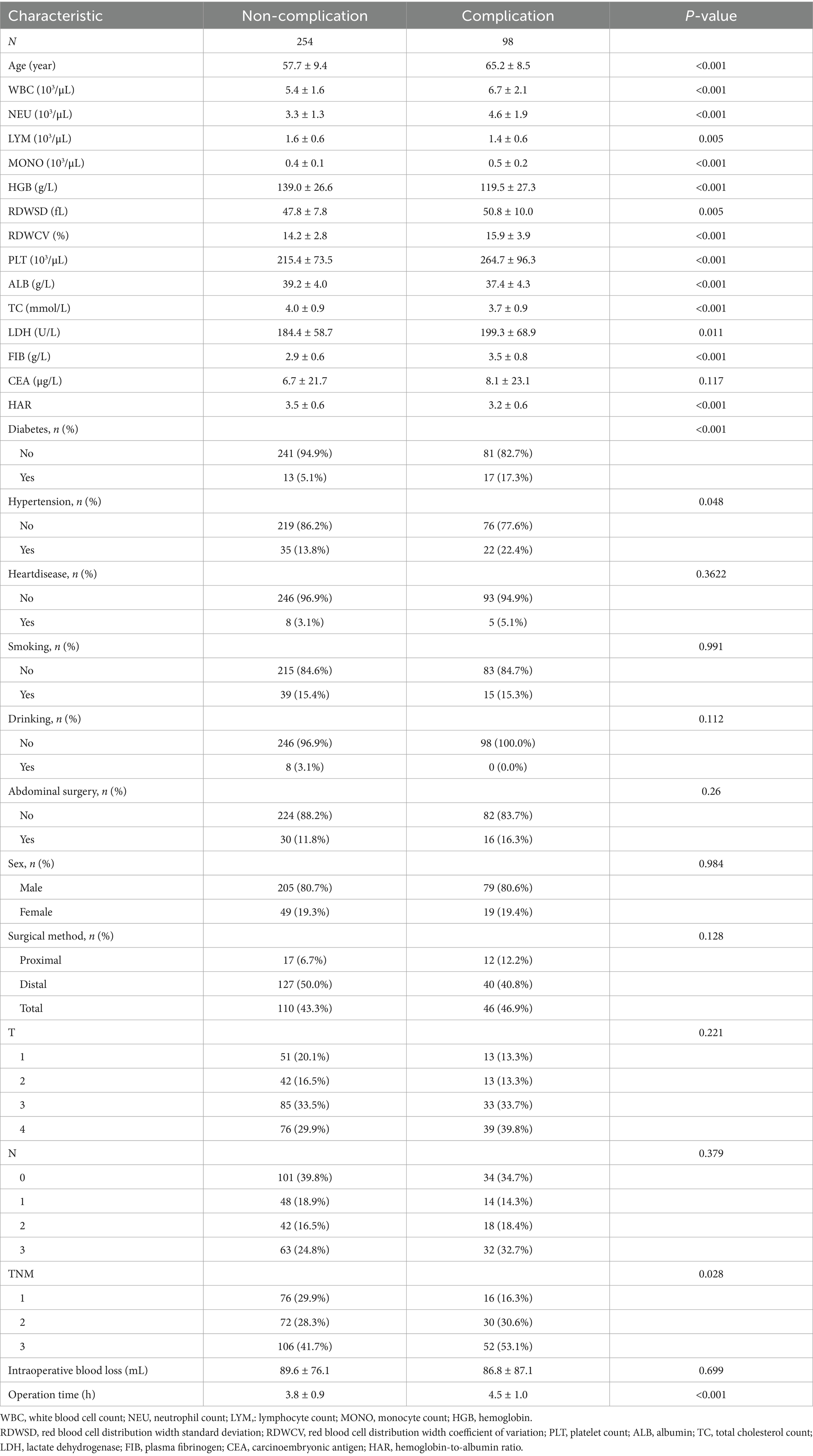 The present study comprised 352 patients diagnosed with gastric cancer who underwent radical gastrectomy. The subjects were divided into two groups: a complication group and a non-complication group. This division was based on the presence or absence of Clavien-Dindo ≥ II-grade complications postoperatively. As demonstrated in Table 1, the preliminary demographic characteristics analysis indicated that the mean age of the complication group (65.2 ± 8.5 years) was considerably higher than that of the non-complication group (57.7 ± 9.4, p < 0.001). With respect to hemoglobin (HGB) levels, the complication group (119.5 ± 27.3) exhibited significantly lower levels in comparison to the non-complication group (139.0 ± 26.6, p < 0.001). The operation time in the complication group (3.8 ± 0.9 h) was significantly longer than that in the non-complication group (4.5 ± 1.0, p < 0.001). Furthermore, the complication group exhibited significantly elevated levels of white blood cell count (WBC), neutrophil count (NEU), monocyte count (MONO), and platelet count (PLT) (p < 0.001). There were no significant differences in gender distribution between the two groups; however, the proportion of elderly patients in the complication group (75.5%) was significantly higher than that in the non-complication group (39.0%, p < 0.001). The prevalence of diabetes mellitus in the complication group (17.3%) was significantly higher than that in the non-complication group (5.1%, p < 0.001). However, there were no significant differences in the prevalence of cardiovascular disease between the two groups. Furthermore, the HAR index in the complication group was 3.5, which is significantly higher than the 3.2 in the non-complication group.