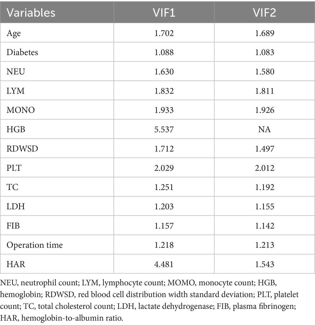 Subsequently, we used VIF analysis to address potential multicollinearity issues among variables. The results of the variance inflation factor analysis (Table 2) showed that after excluding hemoglobin level (HGB) and red blood cell distribution width standard deviation (RDWSD), the variance inflation factor values of all remaining variables were less than 5, indicating that there were no multicollinearity issues.