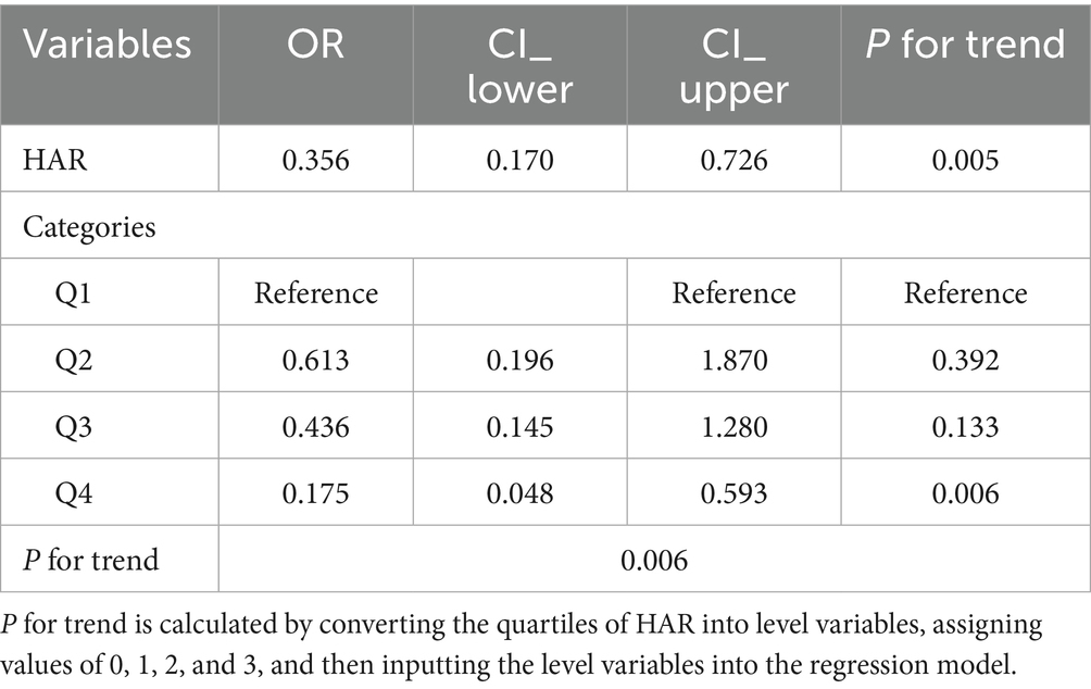 Sensitivity analysis showed that after excluding the upper and lower 1% of outliers before and after HAR (Table 5), the association remained statistically significant, with an adjusted odds ratio (OR) of 0.175 (95% confidence interval, 0.048–0.593; p = 0.006), indicating a significant negative correlation between the highest HAR group and event risk. Trend analysis further supported the conclusion that higher HAR values are associated with lower event risk (trend p-value = 0.006). The ROC curve shows that the AUC of HAR is higher than that of PNI, PAR, and CONUT score (Supplementary Figure S1).
