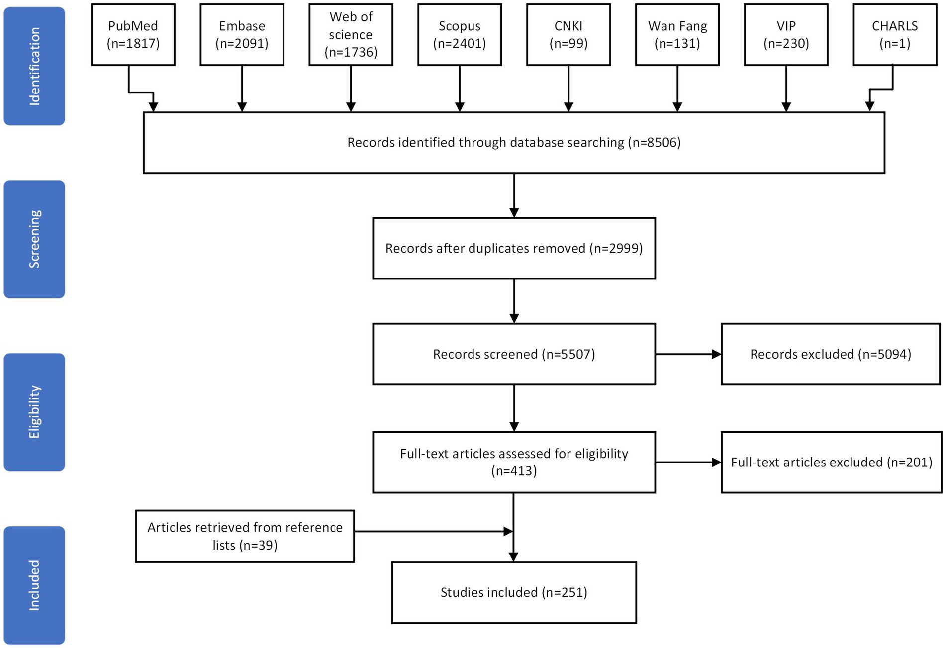 A total of 8,506 articles were initially identified through systematic keyword searches, of which 251 met the inclusion criteria (Figure 1). Based on the extracted functional items from these studies, an initial pool of 69 knee function assessment items was compiled (5–7, 14, 18–25).
