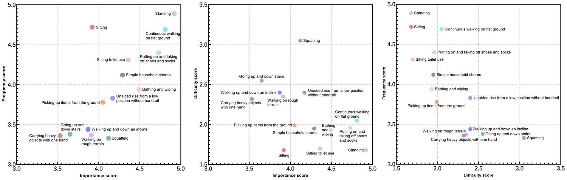 After 14 high-frequency functional activities identified as most important for Chinese TKA patients, a comprehensive analysis was performed to examine the relationships among importance, frequency, and difficulty ratings across all participants.