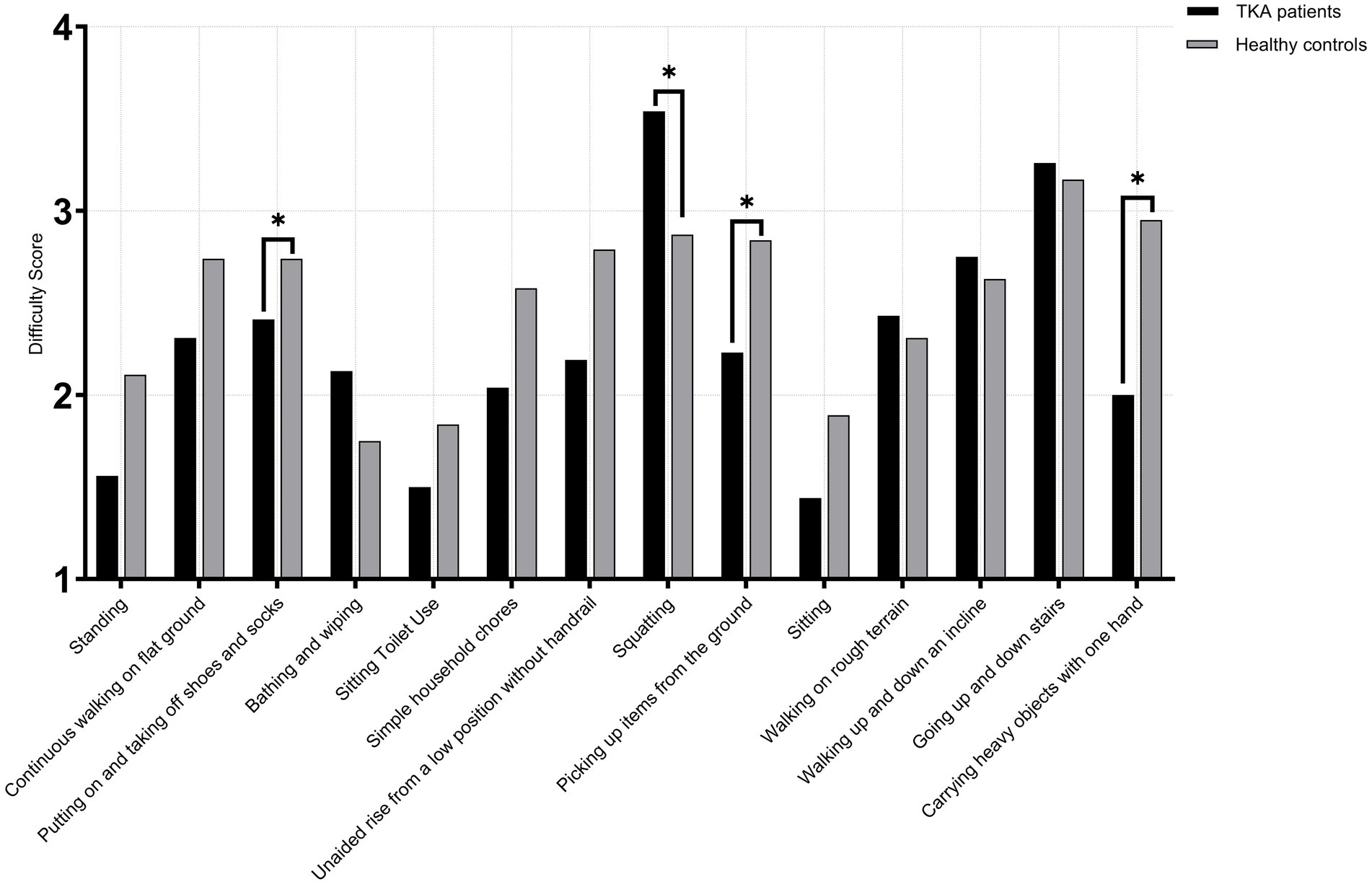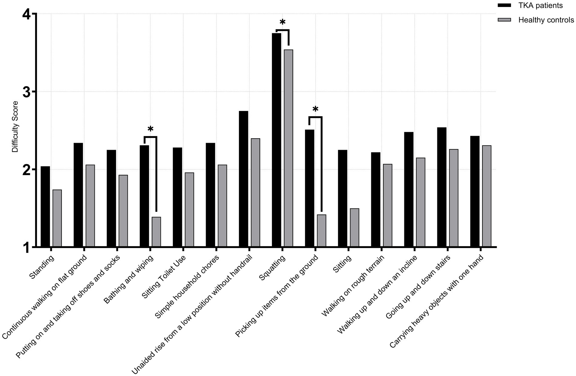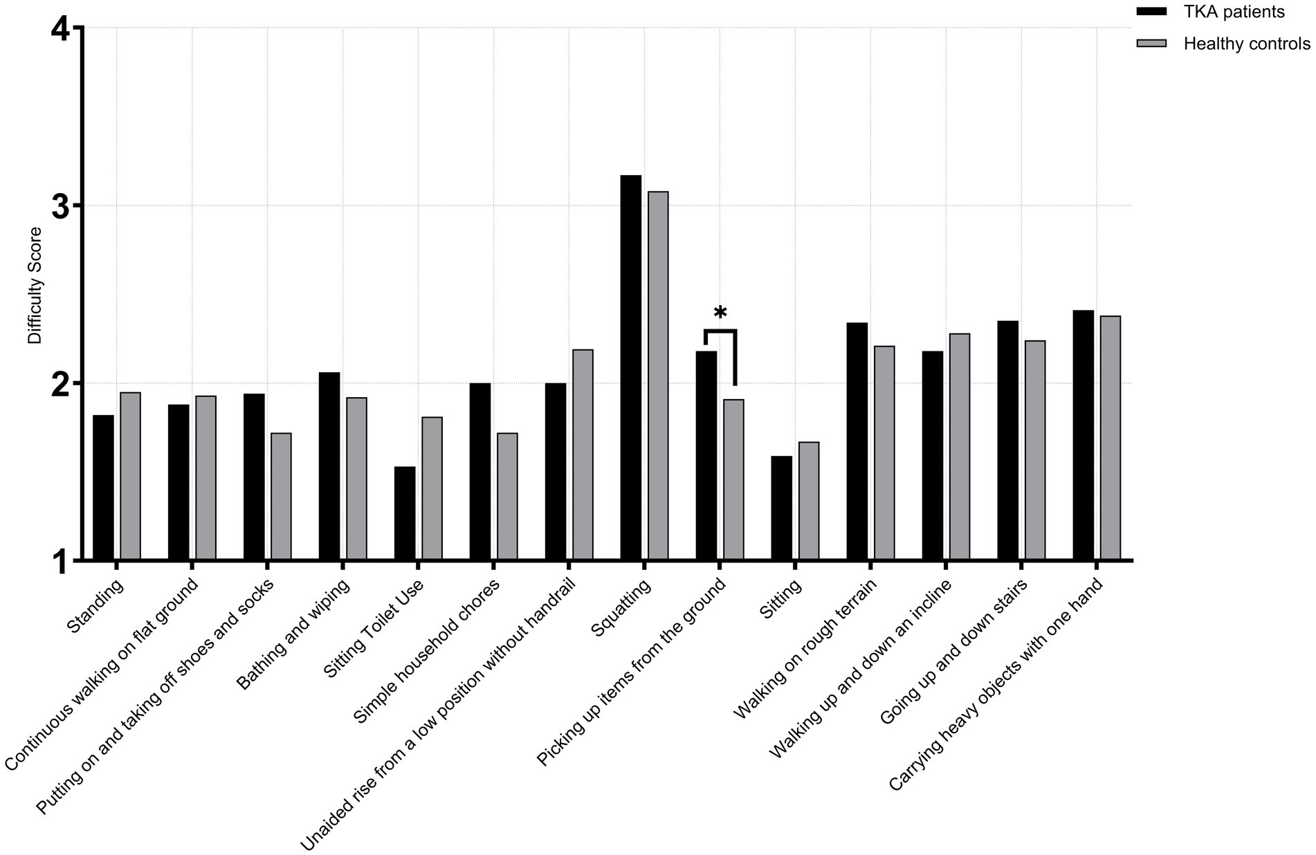 Figure 5. Activity difficulty scores in male TKA patients compared with healthy controls (>75 years).