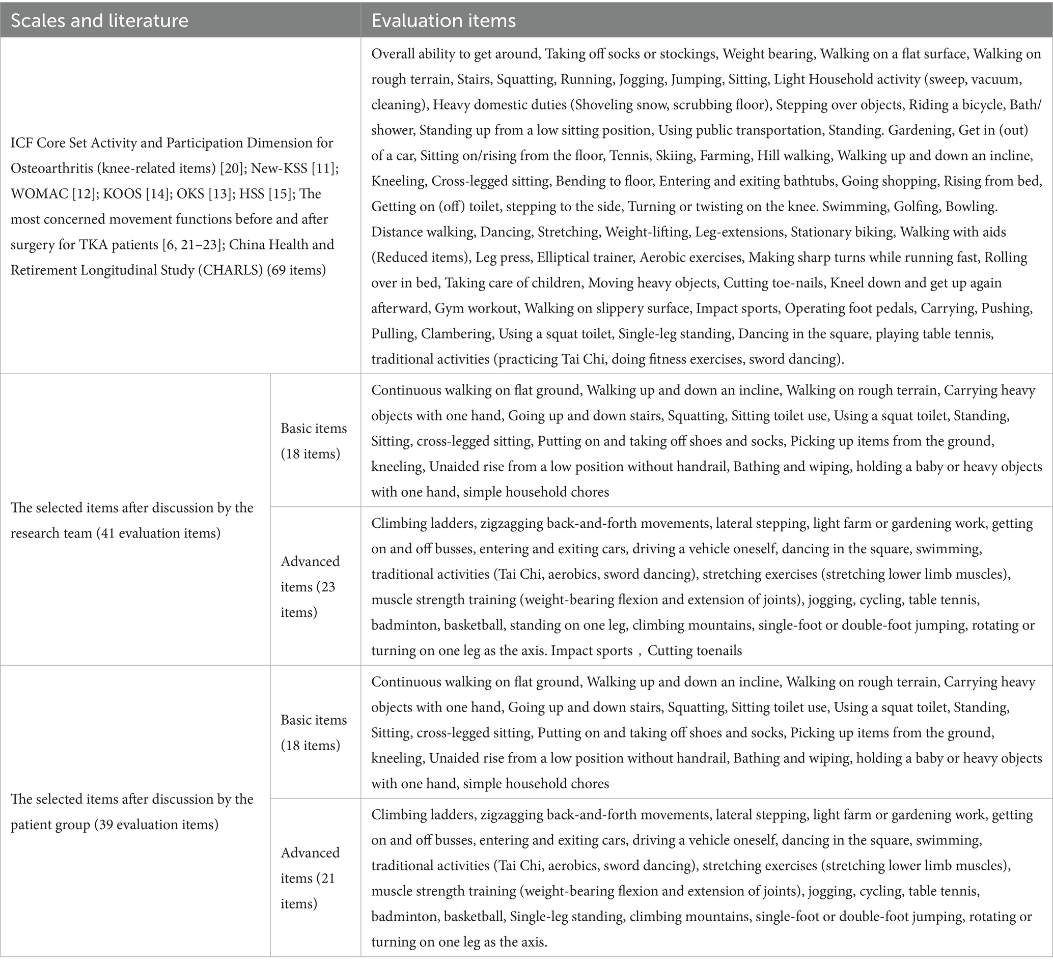 Most identified items originated from Western-developed scales based on Western cultural norms and lifestyles. The applicability of cross-culturally adapted Chinese versions to Chinese populations remains controversial (26). For instance, items like “getting in and out of a bathtub” from the WOMAC scale and high-level recreational activities (golf, bowling, gardening) in the KSS scale may not align with Chinese living conditions and culture, potentially affecting measurement validity (27). Sociocultural factors also influence patients’ functional priorities. Chinese TKA patients generally place greater emphasis on self-care and basic functional independence, while attaching less importance to social or sports-related activities (28).