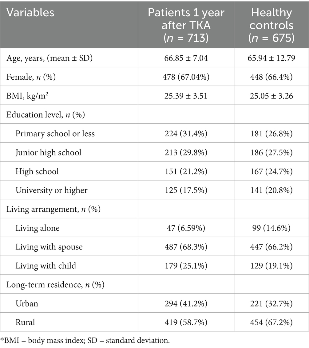 Questionnaire data were collected from February to December 2024 at Xi’an Honghui Hospital. A total of 713 patients who were 1 year post–TKA and 675 healthy controls were enrolled (Table 2).