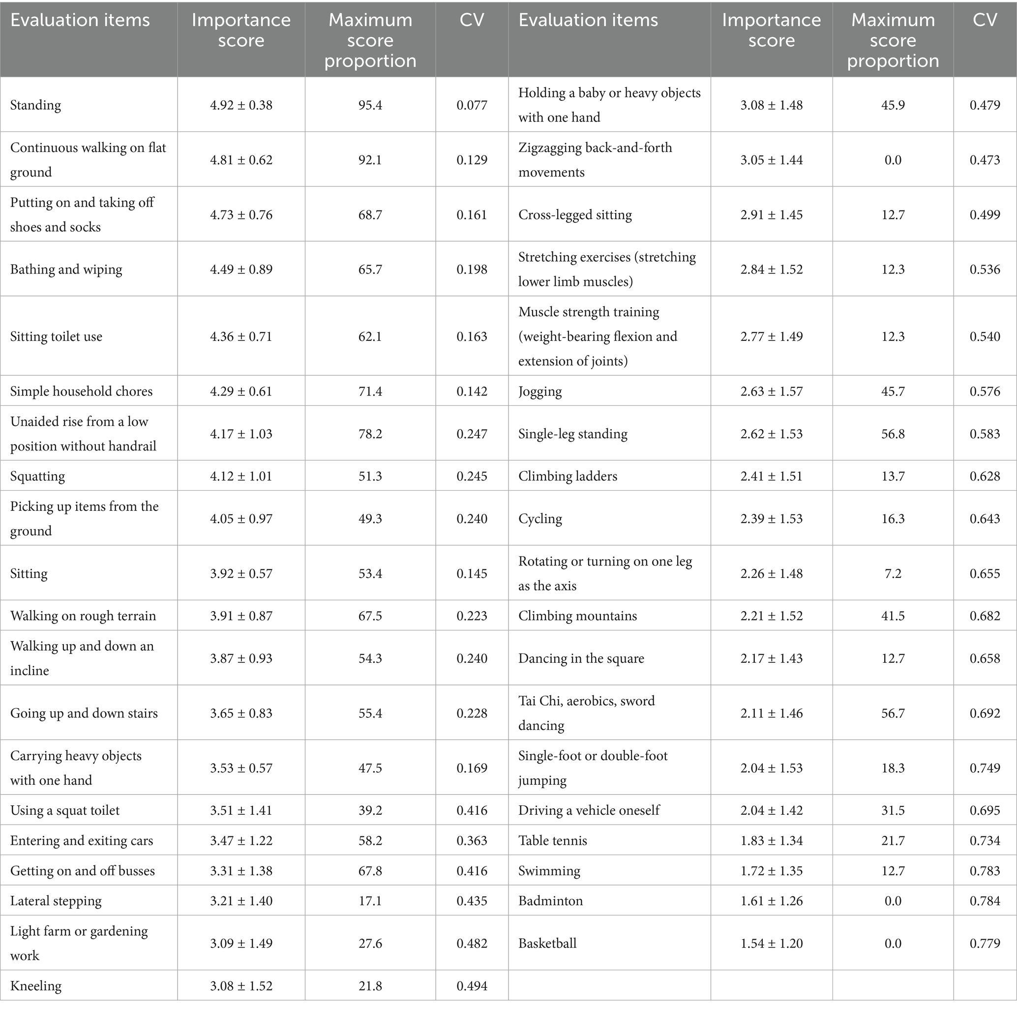 Data were processed and analyzed using SPSS version 26.0. For each item, the importance score was summarized as Mean ± SD, along with the percentage of participants assigning a full score (5 points). Based on the predefined selection criteria—mean importance score >3.5 and CV < 0.25—a total of 14 high-frequency functional activities were identified (Table 3).