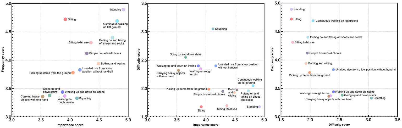 All 14 selected items were categorized as basic functional activities, including: Standing, Continuous walking on flat ground, Putting on and taking off shoes and socks, Bathing and wiping, Sitting toilet use, Simple household chores, Unaided rise from a low position without handrail, Squatting, Picking up items from the ground Sitting, Walking on rough terrain, Walking up and down an incline, Going up and down stairs, Carrying heavy objects with one hand.