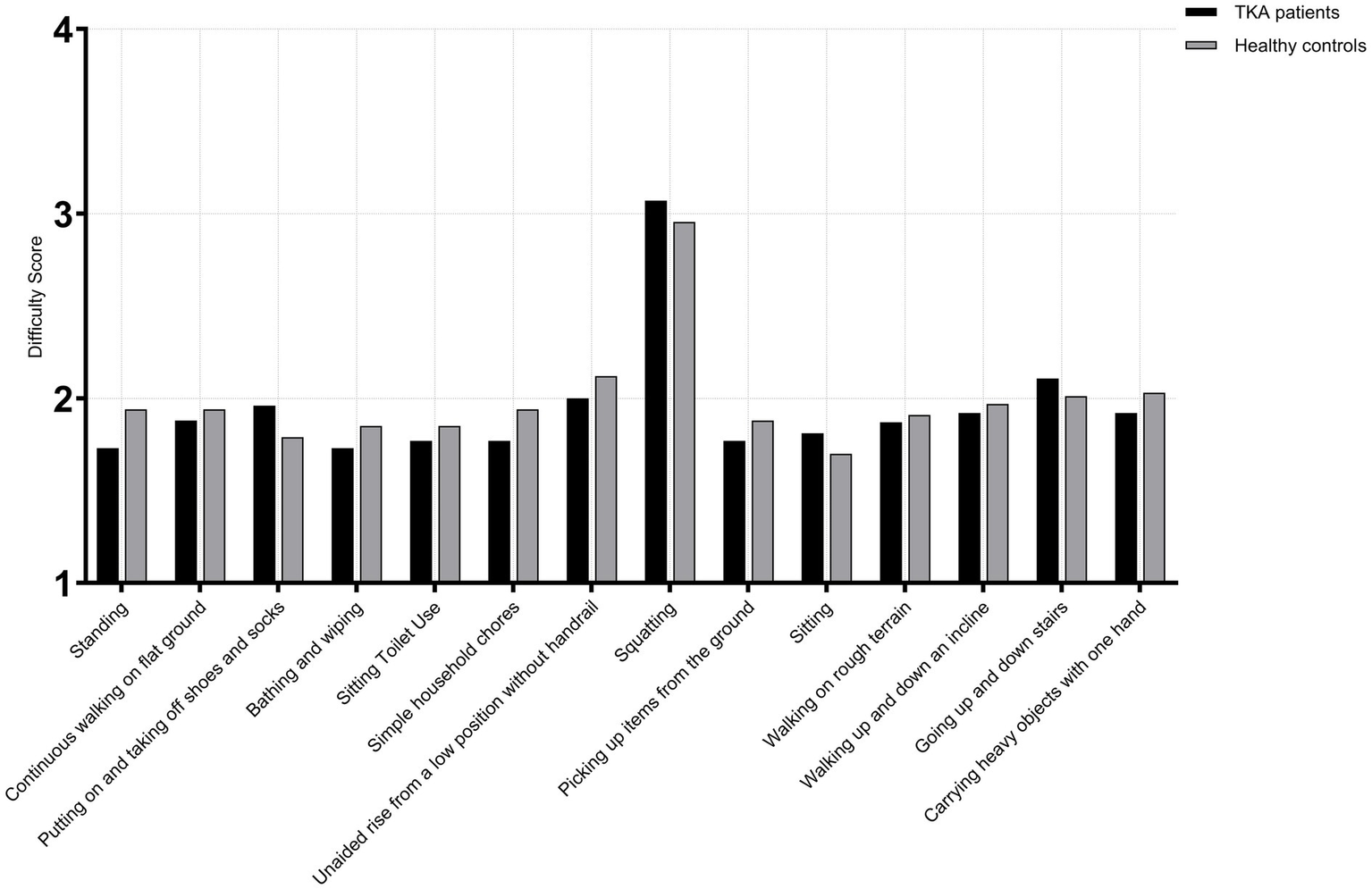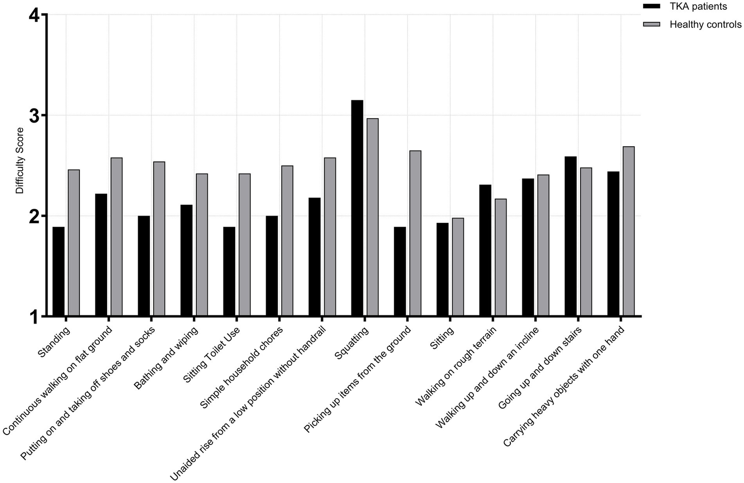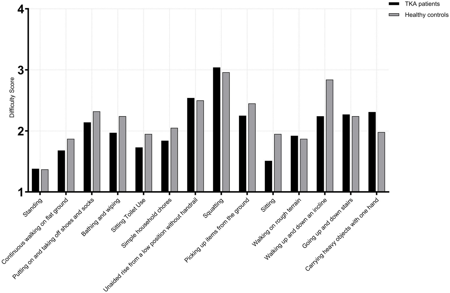 Both TKA patients and healthy controls were required to assess and rate each activity in terms of: Importance (1 = Not important, 2 = Slightly important, 3 = Moderately important, 4 = Very important, 5 = Extremely important), Frequency (1 = Never, 2 = Rarely, 3 = Occasionally, 4 = Often, 5 = Daily), Difficulty (1 = No difficulty, 2 = Slight difficulty, 3 = Moderate difficulty, 4 = Severe difficulty, 5 = Extreme difficulty).