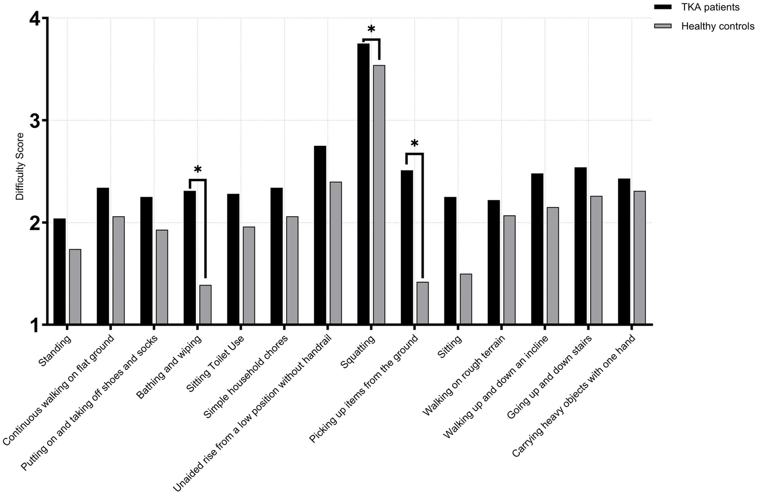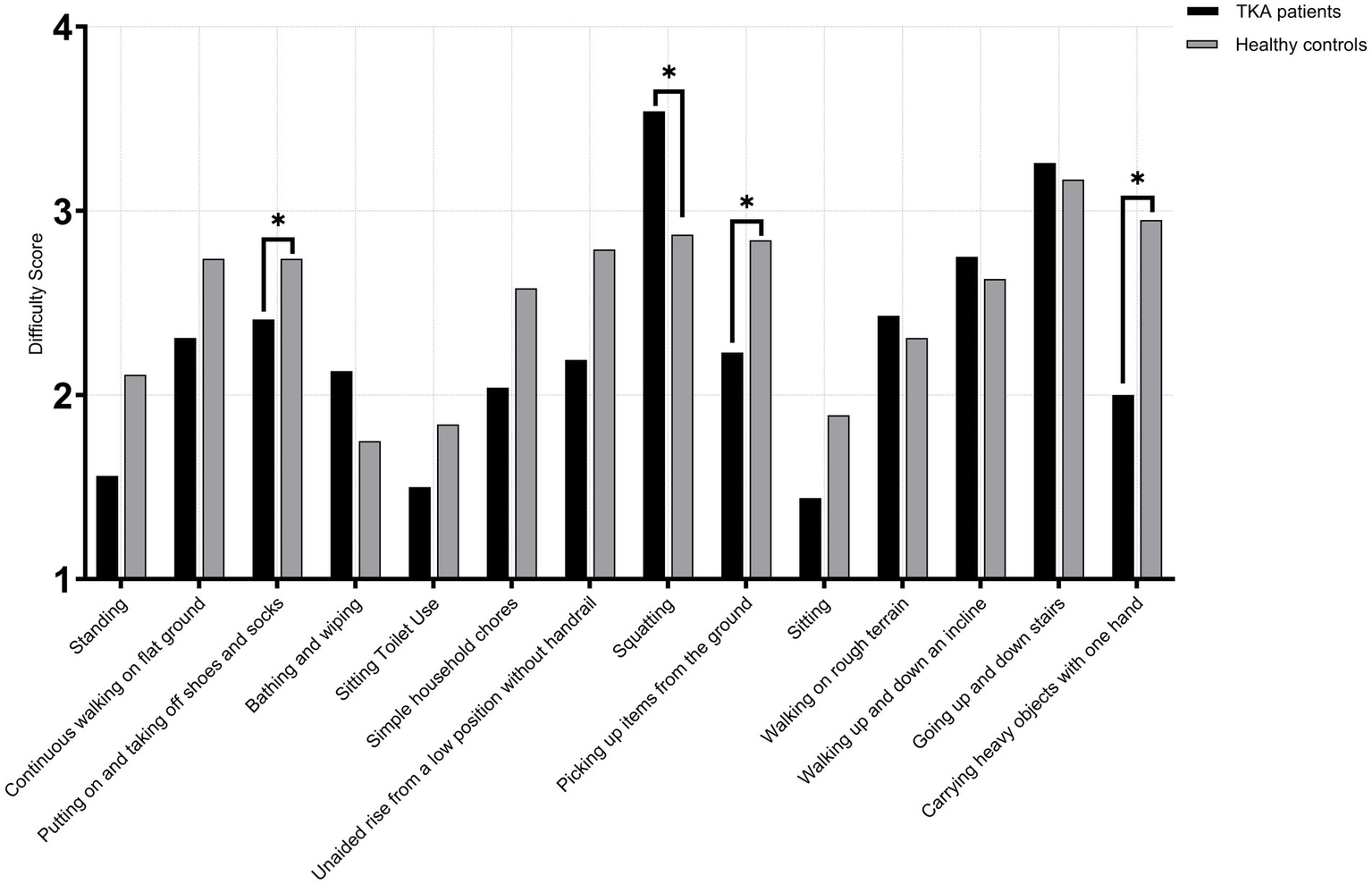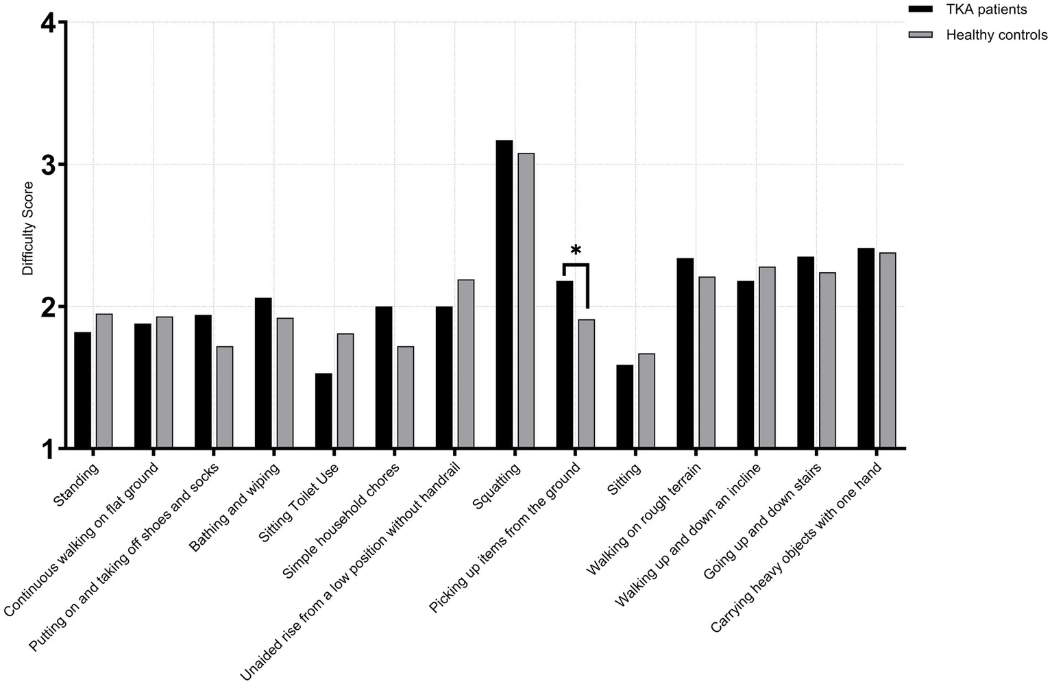 Both TKA patients and healthy controls were required to assess and rate each activity in terms of: Importance (1 = Not important, 2 = Slightly important, 3 = Moderately important, 4 = Very important, 5 = Extremely important), Frequency (1 = Never, 2 = Rarely, 3 = Occasionally, 4 = Often, 5 = Daily), Difficulty (1 = No difficulty, 2 = Slight difficulty, 3 = Moderate difficulty, 4 = Severe difficulty, 5 = Extreme difficulty).