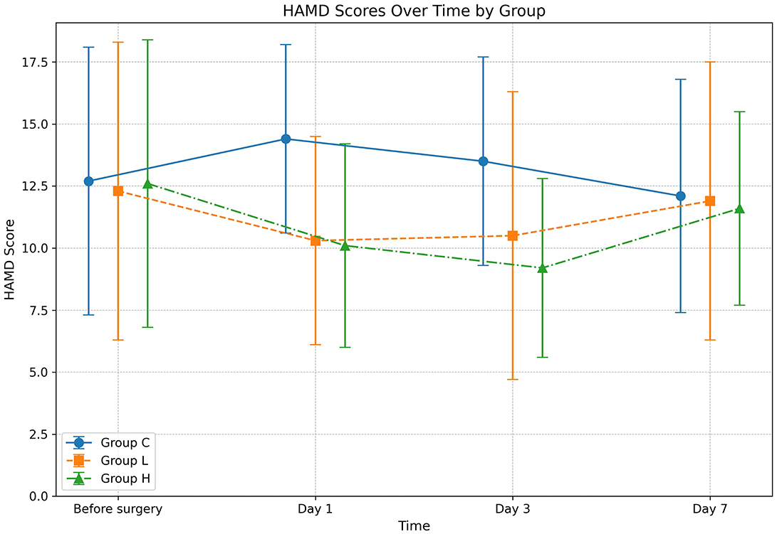 Figure 1. Changes in Hamilton Depression Rating Scale (HAMD) scores over time. The graph displays the mean HAMD scores for Group C (solid line), Group L (dashed line), and Group H (dash-dot line) at four distinct time points: before surgery, and on days 1, 3, and 7 post-surgery. Data are presented as mean ± standard deviation, with error bars indicating the standard deviation at each time point. Statistical analysis was performed using a two-way repeated-measures ANOVA.