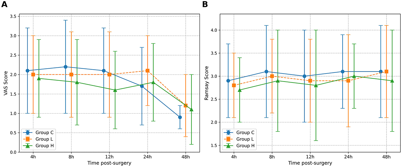 Figure 2. Comparison of Visual Analog Scale (VAS) and Ramsay sedation scores over time. The figure illustrates the postoperative scores for the three study groups: Group C (solid line), Group L (dashed line), and Group H (dash-dot line). (A) The graph displays the mean VAS scores for pain. (B) The graph shows the mean Ramsay sedation scores. Data are presented as mean ± standard deviation, with error bars representing the standard deviation. Measurements were taken at five post-surgery time points: 4 h (T1), 8 h (T2), 12 h (T3), 24 h (T4), and 48 h (T5). A two-way repeated-measures ANOVA was used to analyze the effects of group, time, and their interaction.