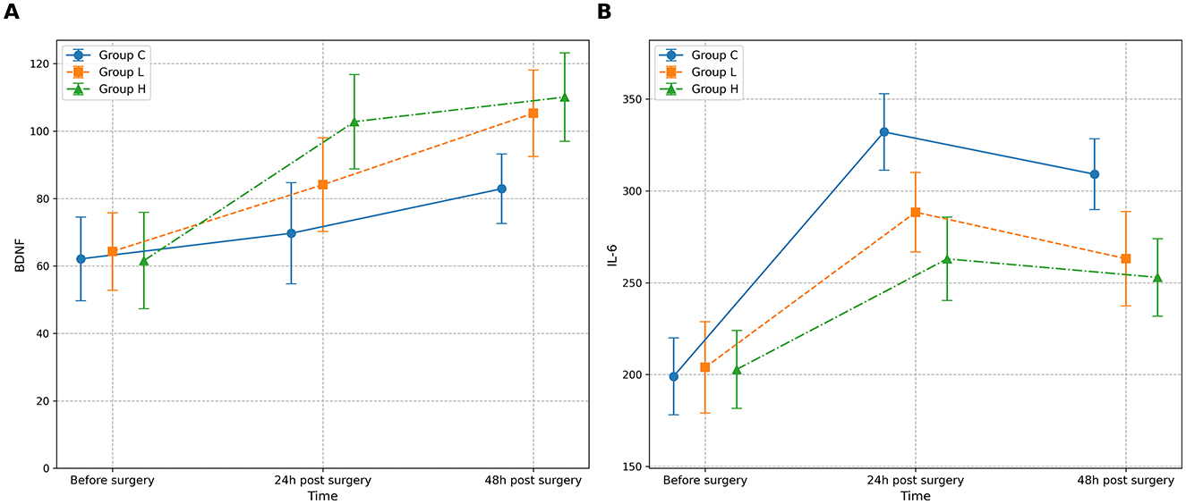 Figure 3. Changes in serum biomarker levels across groups over time. The figure displays the mean concentrations of (A) Brain-Derived Neurotrophic Factor (BDNF) and (B) Interleukin-6 (IL-6) for the three study groups: Group C (solid line), Group L (dashed line), and Group H (dash-dot line). Measurements were performed before surgery, and at 24 and 48 h post-surgery. Data are presented as mean ± standard deviation, with error bars indicating the standard deviation. A two-way repeated-measures ANOVA was used for statistical analysis.