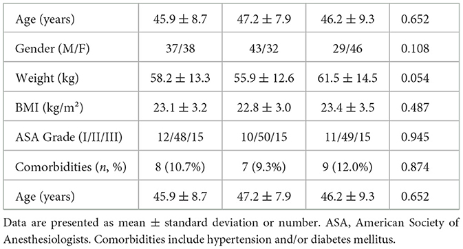 There were no statistically significant differences in baseline demographic and clinical characteristics (including age, gender, weight, body mass index, ASA physical status classification, and the prevalence of comorbidities) or in surgical conditions (including fracture type, surgery type, duration of surgery, anesthesia duration, total intraoperative sufentanil consumption, and estimated blood loss) among the three groups (all P > 0.05, Tables 1, 2).