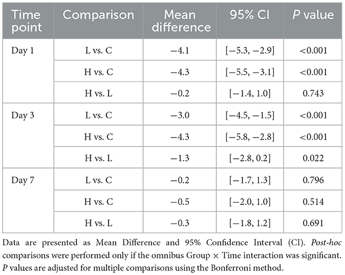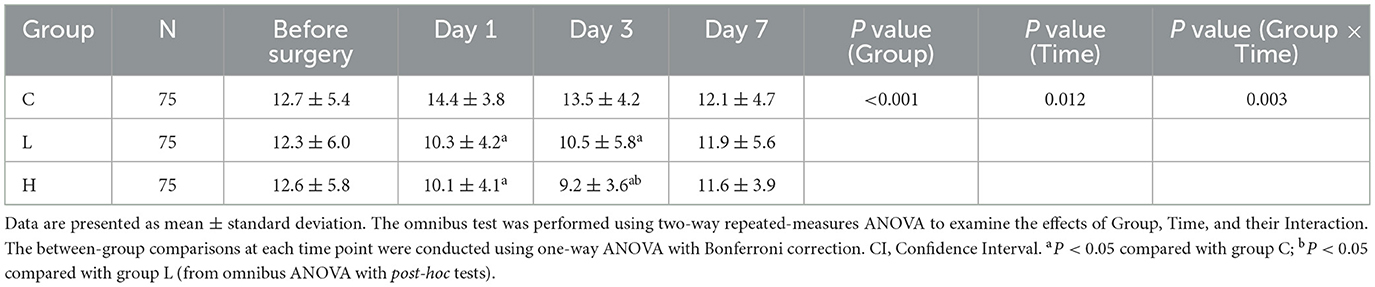 The omnibus two-way repeated-measures ANOVA revealed significant main effects of Group (P < 0.001) and Time (P = 0.012), as well as a significant Group × Time interaction (P = 0.003) on HAMD scores (Table 3). Post-hoc analyses demonstrated that compared with group C, the HAMD scores of groups L and H were significantly lower on days 1 and 3 after surgery (all P < 0.001); compared with group L, the HAMD score of group H was significantly lower on day 3 after surgery (Mean Difference −1.3, 95% CI [−2.8, −0.2], P = 0.022). No significant between-group differences were observed at day 7 (all P > 0.05) (Table 4; Figure 1).