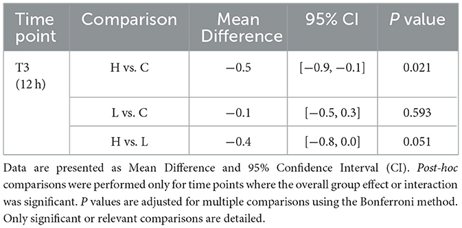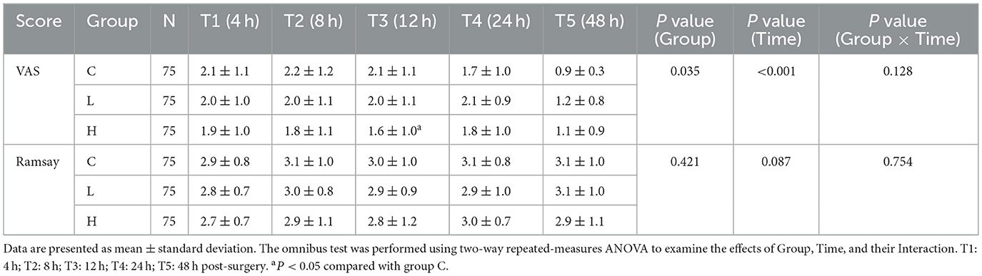 For VAS scores, the omnibus test showed significant main effects of Group (P = 0.035) and Time (P < 0.001), but no significant Group × Time interaction (P = 0.128) (Table 5). Post-hoc comparisons at individual time points revealed that only at T3 (12 h post-surgery) did group H show significantly lower VAS scores compared to group C (Mean Difference −0.5, 95% CI [−0.9, −0.1], P = 0.021) (Table 6). No other significant between-group differences were found at other time points. For Ramsay sedation scores, no significant main effects or interaction were observed (all P > 0.05) (Table 5; Figure 2).