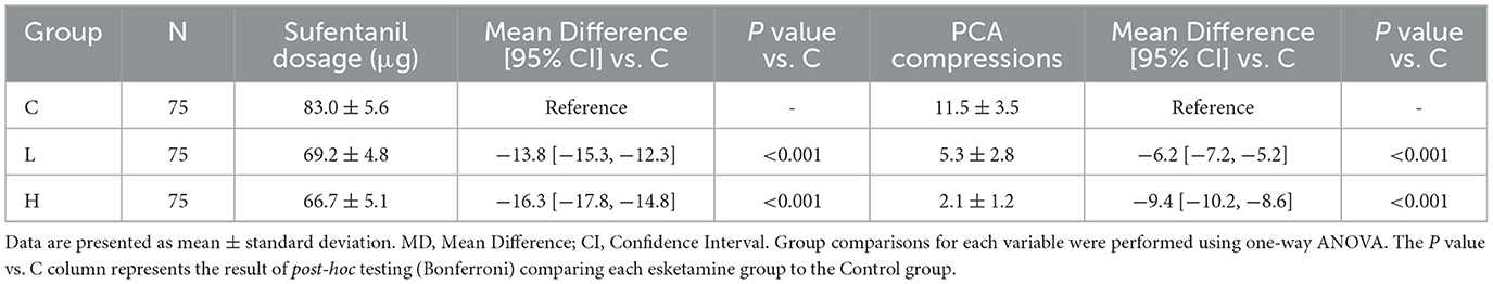 Results: Both esketamine groups (L and H) demonstrated significantly lower HAMD scores on postoperative days 1 and 3 compared to group C (all P < 0.05), with group H showing a greater reduction than group L on day 3 (P < 0.05). Postoperative sufentanil consumption and PCA compressions were significantly reduced in groups L and H vs. C (P < 0.05). Group H also had significantly fewer PCA compressions than group L (P < 0.05). The VAS score was significantly lower in group H than in group C at 12 h post-surgery (P < 0.05). The incidence of postoperative nausea/vomiting was significantly lower in groups L and H compared to group C (P < 0.05).