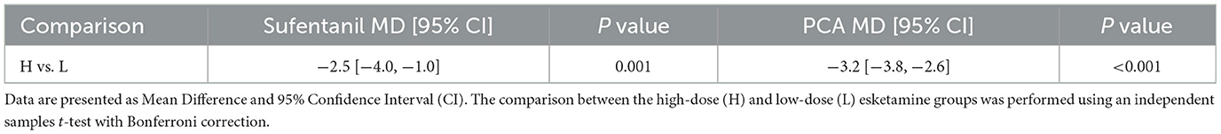 Both esketamine groups significantly reduced postoperative sufentanil consumption compared to group C (L vs. C: MD −13.8 μg, 95% CI [−15.3, −12.3], P < 0.001; H vs. C: MD −16.3 μg, 95% CI [−17.8, −14.8], P < 0.001) (Table 7). Group H also consumed significantly less sufentanil than group L (MD −2.5 μg, 95% CI [−4.0, −1.0], P = 0.001) (Table 8). Similarly, PCA compressions were significantly reduced in both esketamine groups vs. control (L vs. C: MD −6.2, 95% CI [−7.2, −5.2], P < 0.001; H vs. C: MD −9.4, 95% CI [−10.2, −8.6], P < 0.001), with group H showing significantly fewer compressions than group L (MD −3.2, 95% CI [−3.8, −2.6], P < 0.001) (Tables 7, 8).