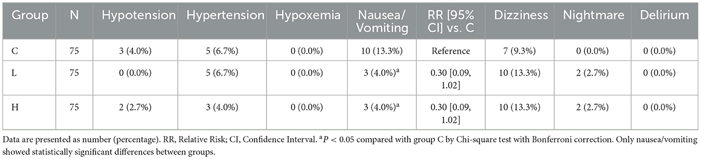 Compared with group C, the incidence of postoperative nausea and vomiting was significantly reduced in both group L and group H (RR 0.30, 95% CI [0.09, 1.02], P < 0.05 for both) (Table 9). No statistically significant differences were observed among the three groups in other adverse reactions including hypotension, hypertension, hypoxemia, dizziness, nightmares, or delirium (all P > 0.05).