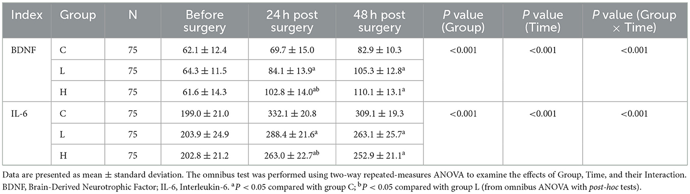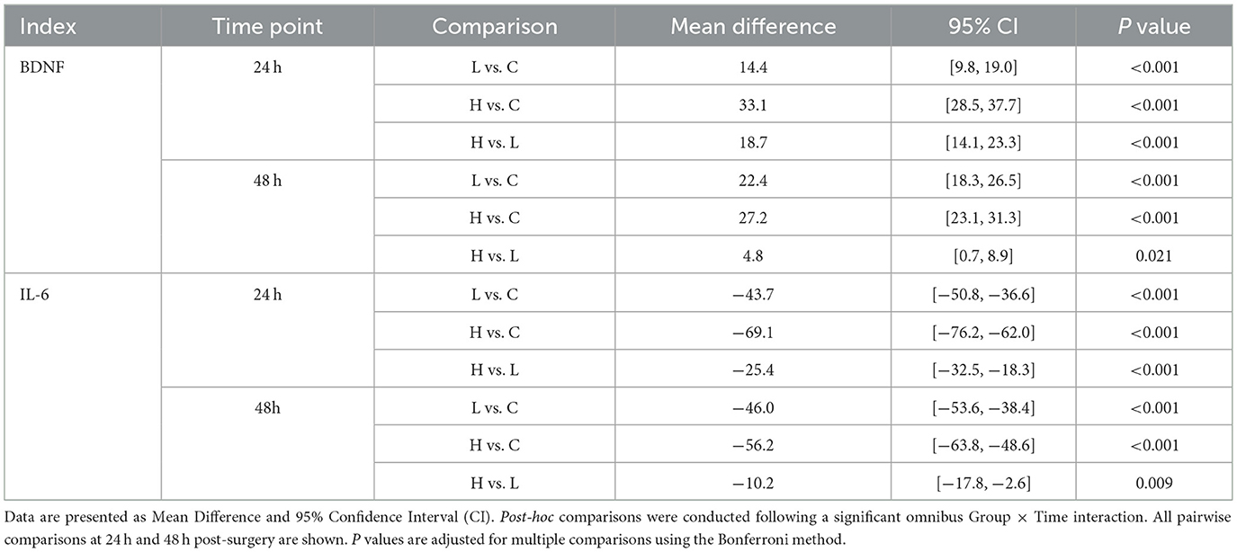 The omnibus two-way repeated-measures ANOVA revealed significant main effects of Group and Time, as well as significant Group × Time interactions for both BDNF and IL-6 levels (all P < 0.001) (Table 10; Figure 3). Post-hoc analyses showed that compared with group C, BDNF levels in groups L and H were significantly increased at 24 and 48 h after surgery (all P < 0.001), while IL-6 levels were significantly decreased (all P < 0.001) (Table 11). Compared with group L, the BDNF level in group H was significantly higher at 24 h after surgery (MD 18.7, 95% CI [14.1, 23.3], P < 0.001), and the IL-6 level was significantly lower (MD −25.4, 95% CI [−32.5, −18.3], P < 0.001) (Table 11).