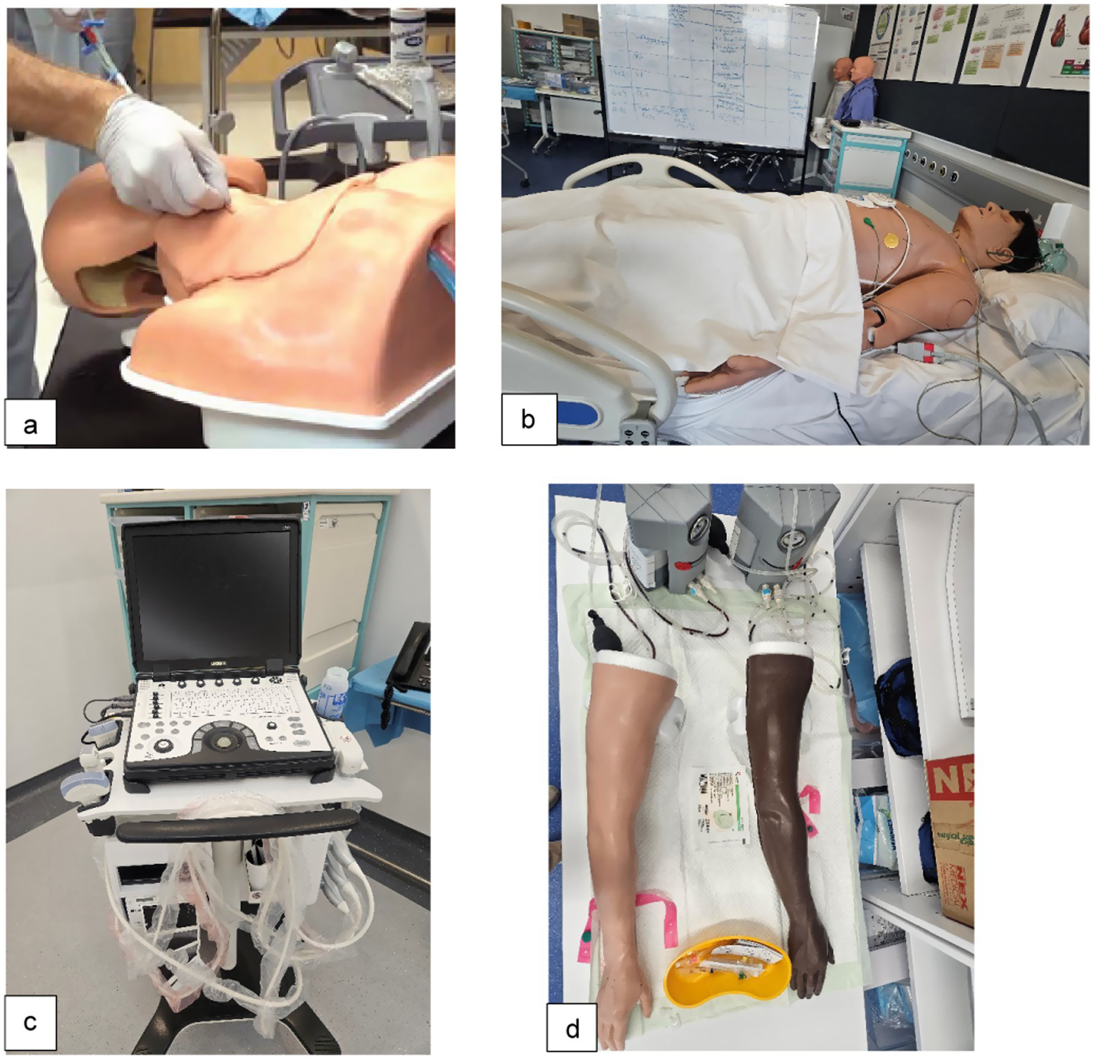 Various simulation modalities aligned with the sessions’ learning objectives. (a) Ultrasound (US)-guided central line insertion: part-task trainer with simulated US machine; (b) Advanced cardiac life support (ACLS): high-fidelity manikin. (c) Point-of-care ultrasound (POCUS): clinical US machine; (d) Intravenous (IV) line insertion: part-task trainer “IV arm.”