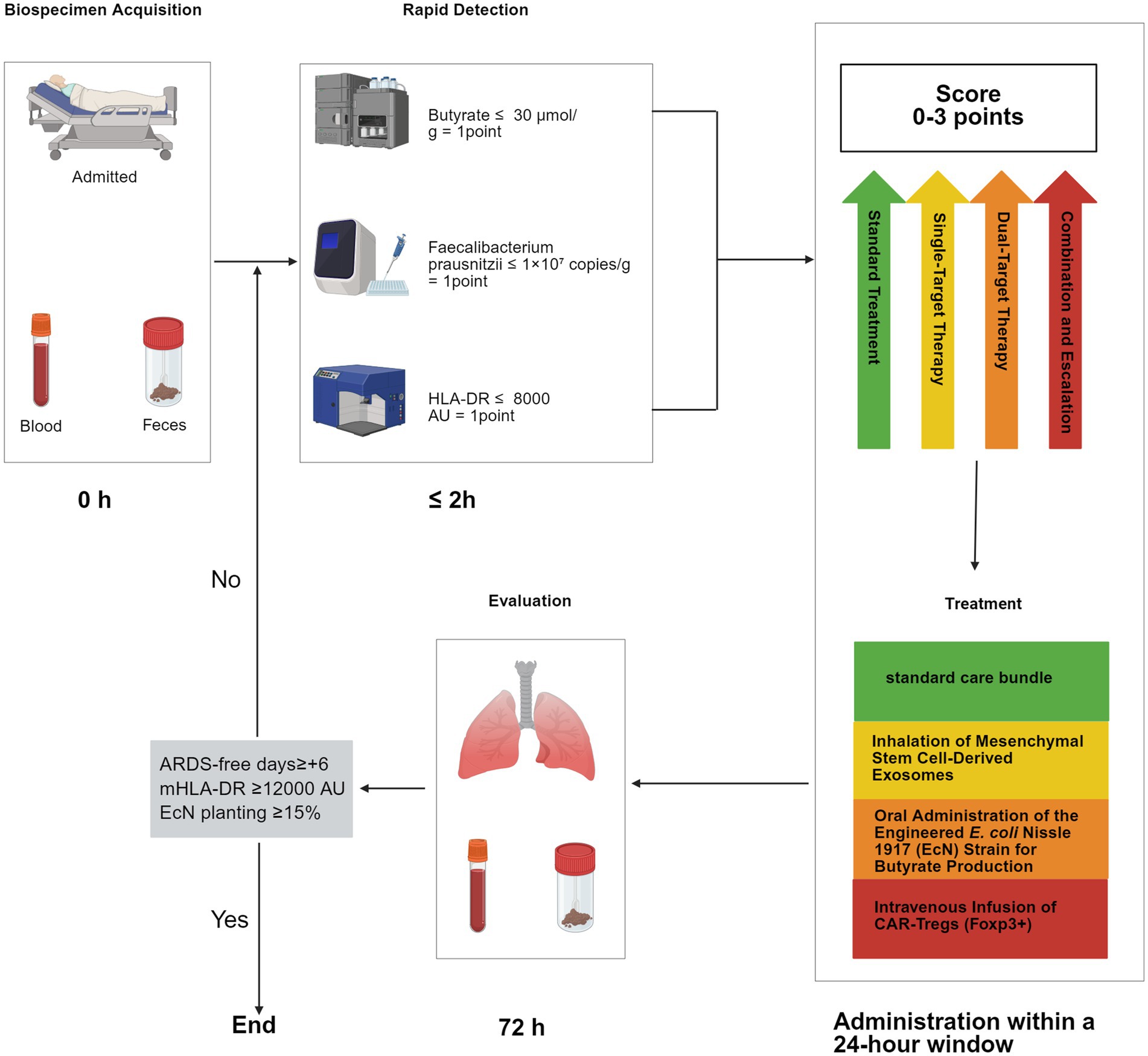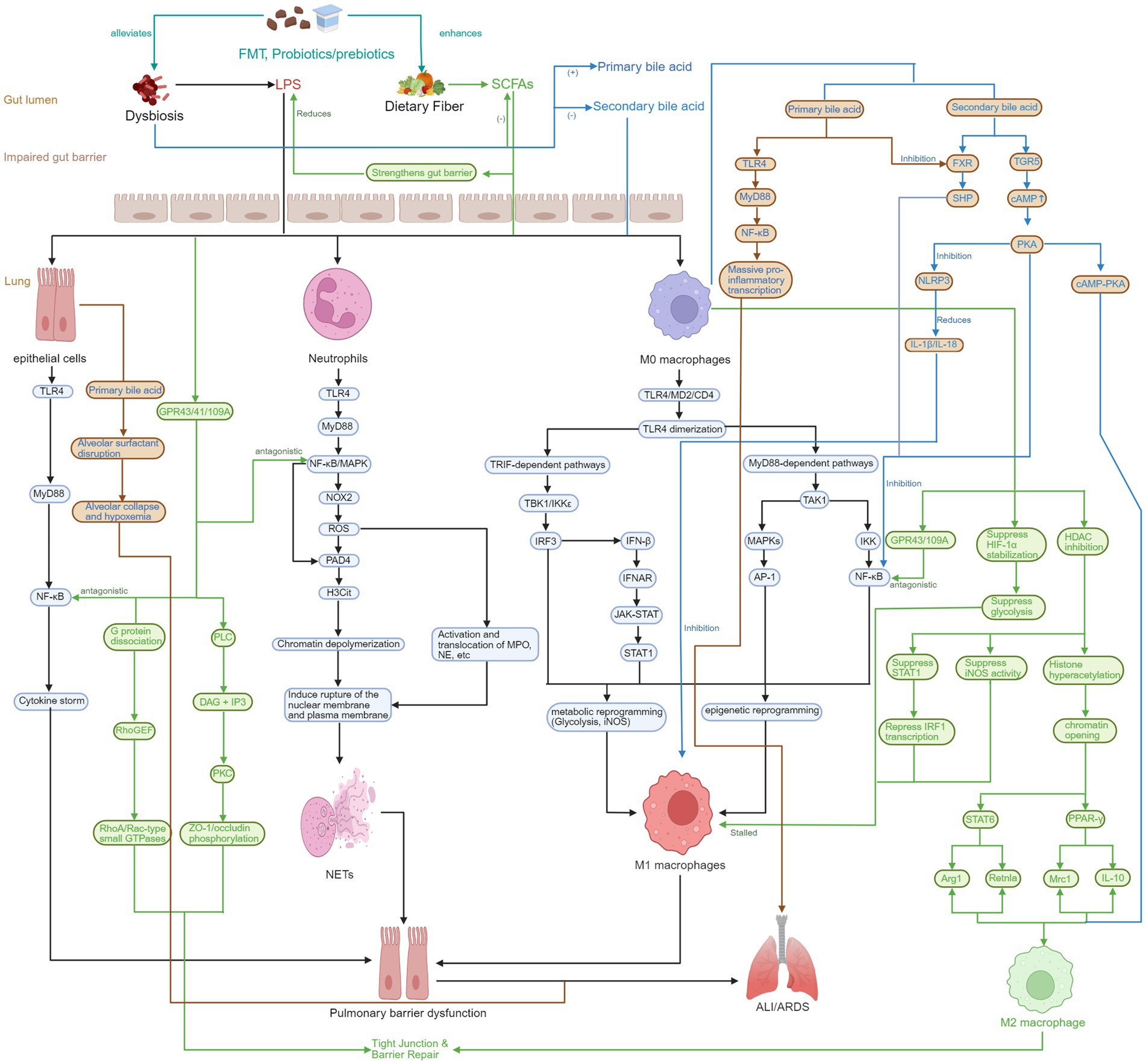 Future research should further investigate neutrophil heterogeneity, the interaction mechanisms between gut microbiota and the host, and the specific roles of related signaling pathways in the pathogenesis of sepsis. Potential therapeutic strategies include inhibiting neutrophil NET formation, regulating neutrophil apoptosis pathways, intervening in TLR9-mediated endoplasmic reticulum stress, and targeting gut microbiota and their metabolites. Meanwhile, elucidating the bidirectional communication mechanism of the gut-lung axis in sepsis-associated ALI/ARDS provides new perspectives for clinical management. For instance, gut-derived molecules such as succinate and trimethylamine N-oxide may serve as early warning indicators for “gut-derived lung injury,” while interventions like modulating bile acid metabolism (e.g., using ursodeoxycholic acid/UDCA) or activating the vagus nerve anti-inflammatory pathway (e.g., via percutaneous vagus nerve stimulation) have demonstrated potential for organ protection through the gut-lung axis. Future studies should focus on validating the feasibility of these gut-derived molecules as biomarkers and identifying patient subgroups that may benefit from corresponding targeted therapies, thereby advancing precision medicine in sepsis treatment.