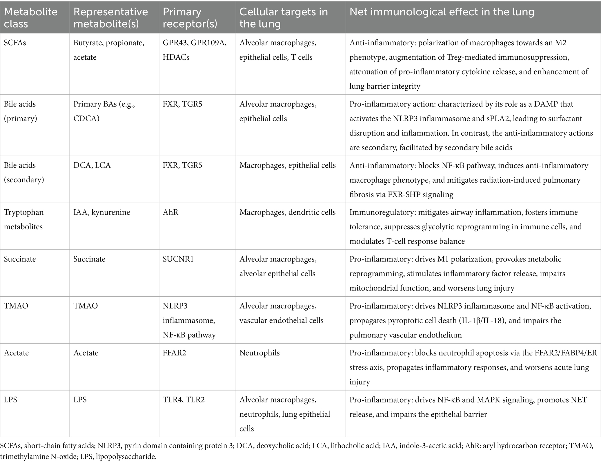 To systematically summarize the immunomodulatory effects of the aforementioned gut microbiota metabolites in the lung, the major metabolite classes, representative molecules, receptors, cellular targets, and net immunological effects are summarized in Table 1.