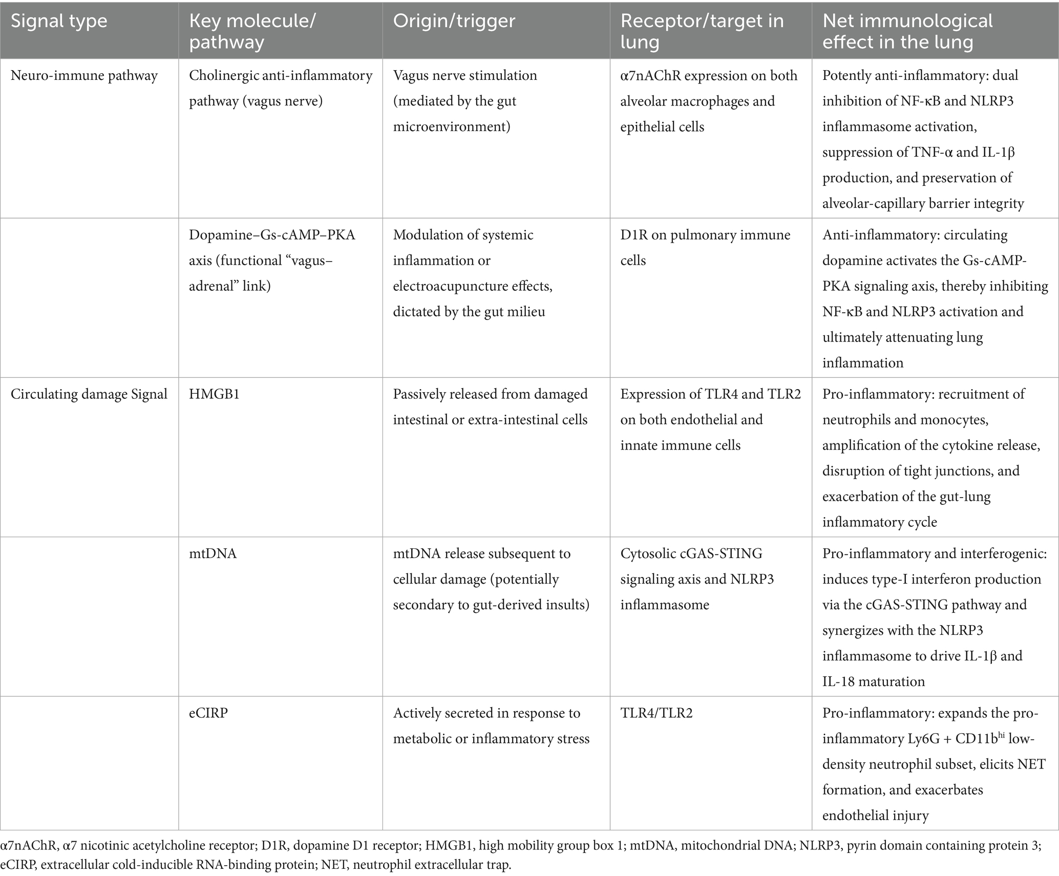 To summarize the role of neuro-immune signaling in pulmonary immunity during sepsis, Table 2 details key signaling molecules and their immunological effects.