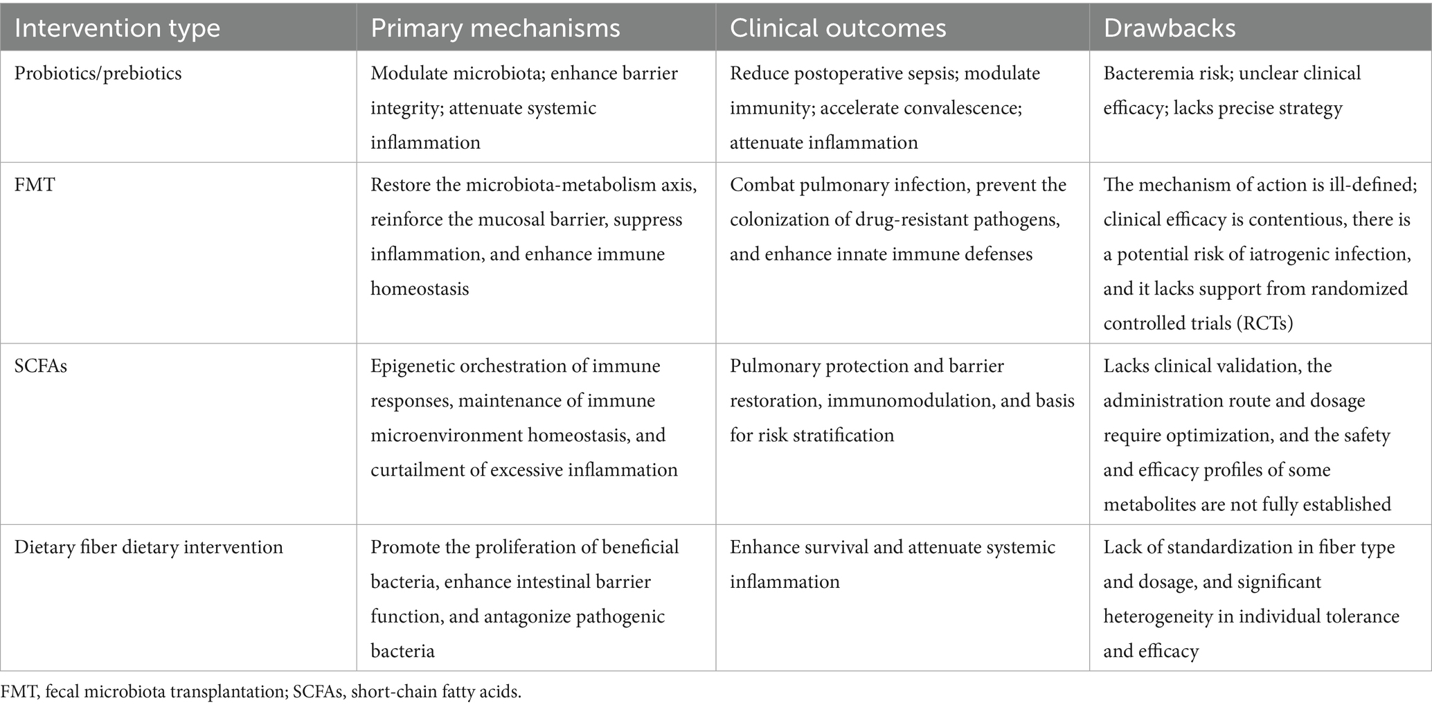 Building upon the complex mechanisms of gut-lung axis immunometabolic regulation, various microbiome-targeted interventions have been developed and show promise in preclinical models. However, their successful translation into clinical practice requires addressing and overcoming the significant heterogeneity within the critically ill patient population and the unique challenges of the ICU setting. The successful application of the interventions discussed below heavily relies on precise patient stratification, strict control of indications, optimal timing, and optimized delivery methods. The following Table 2 and subsequent discussion will focus on examining the mechanisms, clinical outcomes, and practical challenges associated with these strategies.
