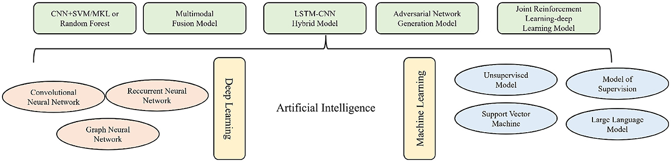 AI is playing a pivotal role in advancing medical paradigms, demonstrating considerable potential in the early prediction, diagnostic-therapeutic optimization, and prognostic evaluation of COPD. The field encompasses a spectrum of architectures, ranging from traditional machine learning (ML), including support vector machines and random forests, to deep neural networks–such as convolutional neural networks (CNNs), recurrent neural networks (RNNs), and graph neural networks (GNNs). More recent developments include multi-modal fusion, adversarial generative models, and integrated reinforcement-learning systems, which substantially improve capabilities in processing and interpreting multi-source, heterogeneous medical data. To provide a systematic overview of the AI models discussed herein and their applications in COPD management, we have categorized key algorithms and their respective functions in Figure 1. This figure serves as a conceptual and technical framework for the subsequent discussion of each model's mechanistic role and clinical utility across the stages of prediction, diagnosis, and prognosis in COPD. Finally, this review systematically examines the role of AI in predictive and early-warning systems, innovations in diagnostic identification, and the distinctive implications for prognostic assessment in COPD.