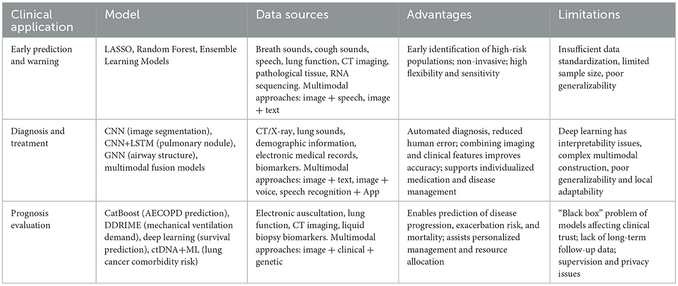 Artificial Intelligence, as an emerging technology that simulates, extends, and enhances human cognitive capabilities, has become deeply integrated into the medical field across multiple dimensions. Its rapid advancement in the healthcare sector has driven innovation in medical algorithms, encompassing both disease diagnosis and treatment as well as the management of patient health data (1–3). The core branches of AI applied in the medical field include Machine Learning and Deep Learning. Machine Learning enables autonomous decision-making through the recognition of data patterns and, in clinical applications, has generated a series of diagnostic, therapeutic, and predictive models by applying AI algorithms to structured data (4–6). Deep Learning processes high-dimensional, unstructured data using multi-layer neural networks. For example, Convolutional Neural Networks (CNNs) excel in image analysis, Recurrent Neural Networks (RNNs) are effective for time-series data (such as lung sound signals), and Graph Neural Networks (GNNs) are capable of analyzing complex biological network relationships (such as airway tree structures) (7). The primary value of AI in healthcare lies in transforming raw medical data—such as images, physiological signals, and genetic information—into actionable clinical insights.