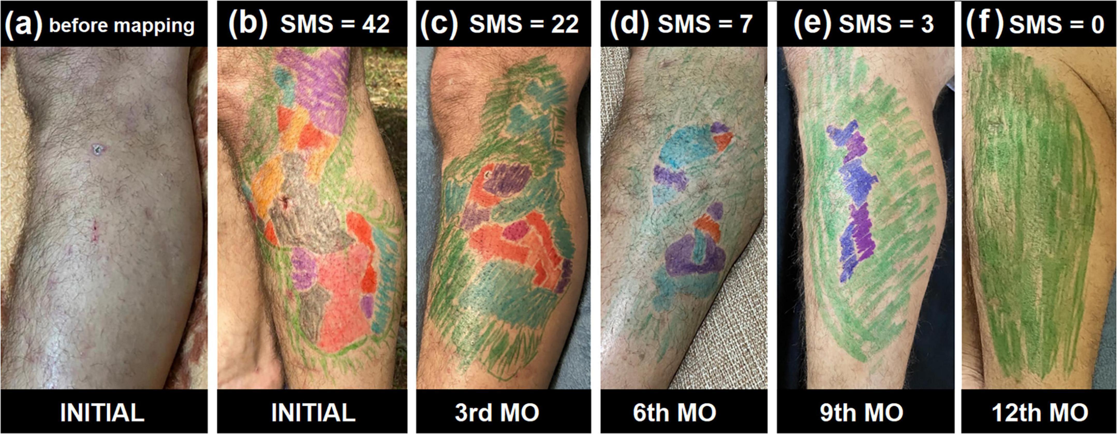 Figure 1. Temporal evolution of cutaneous sensitivity scores during treatment. (a–f) Illustrate the progressive recovery of tactile sensitivity in a representative patient included in this study (1 of 40 cases), based on serial Semmes-Weinstein Monofilament (SWM) mappings over 12 months during treatment. (a) The clinical appearance of the skin before any mapping showing a large hypochromic patch with thinning hair. (b) Presents the baseline sensitivity map with a Sensitive Mapping Score (SMS) of 42. (c–e) Correspond to the third, sixth, and ninth months of treatment, with respective SMS values of 22, 7, and 3. (f) Depicts the final evaluation at the twelfth month (discharge), demonstrating full sensory recovery with SMS = 0. The color-coded overlays represent the degree of tactile impairment, with gradual replacement by green areas indicating normalization of sensation over time. Color code from the SWM evaluation: GREEN (0.07 g-force); Blue (0.02 g-force); Violet (2 g-force); Red (4 g-force); Orange (10 g-force); Pink (300 g-force); Black (no tactile sensation).