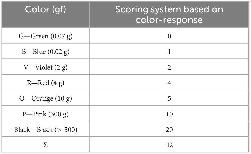 Tactile sensitivity was evaluated at seven standardized points on each hand and 11 points on each foot using SWM, 38 mm in length and calibrated to exert a defined axial force ranging from 0.07 to 300 gram-force (gf) (10, 21). These filaments are color-coded green (0.07 gf), blue (0.2 gf), violet (2.0 gf), red (4.0 gf), orange (10.0 gf), pink (300 gf), and black (> 300 gf) to enable semi-quantitative assessment of sensory loss. The green monofilament (0.07 gf), identified by Semmes and Weinstein with the logarithmic code “2.83,” initiates buckling with approximately 0.068–0.07 gf and is widely accepted as the tactile threshold of normality for the hands and trunk (21, 22). For plantar regions, the blue filament (0.2 gf) is considered the normal threshold due to thicker skin (10, 23). The monofilaments used in this study were manufactured by SORRI-BAURU, Brazil, following the original specifications by Semmes and Weinstein, using identical nylon type and extrusion diameter, and according to the Brazilian Ministry of Health guidelines. Similarly, SWMs ranging from 0.07 to 300 gf were used to assess tactile sensitivity on hypochromic macules. As described by Frade et al. (10, 22), perception of the green monofilament (0.07 gf) in these areas was classified as a normal tactile threshold. The test progression followed a stepwise approach, with the color corresponding to the smallest monofilament perceived by the patient being recorded.